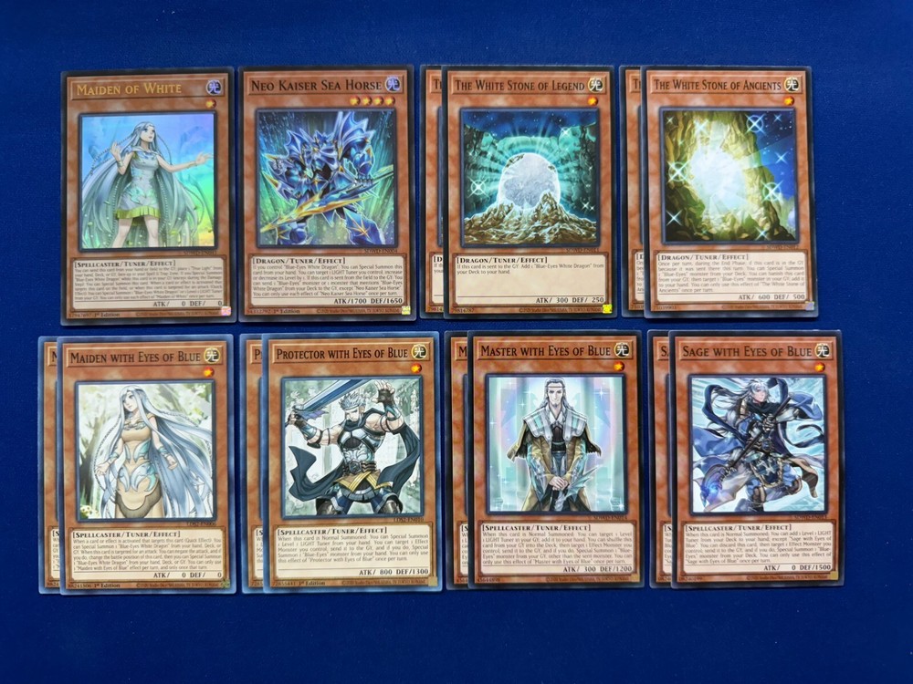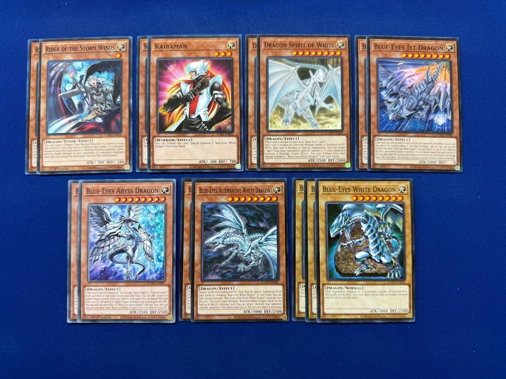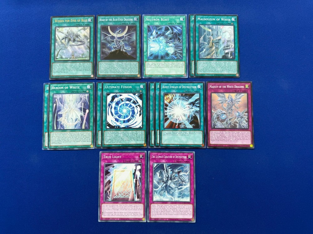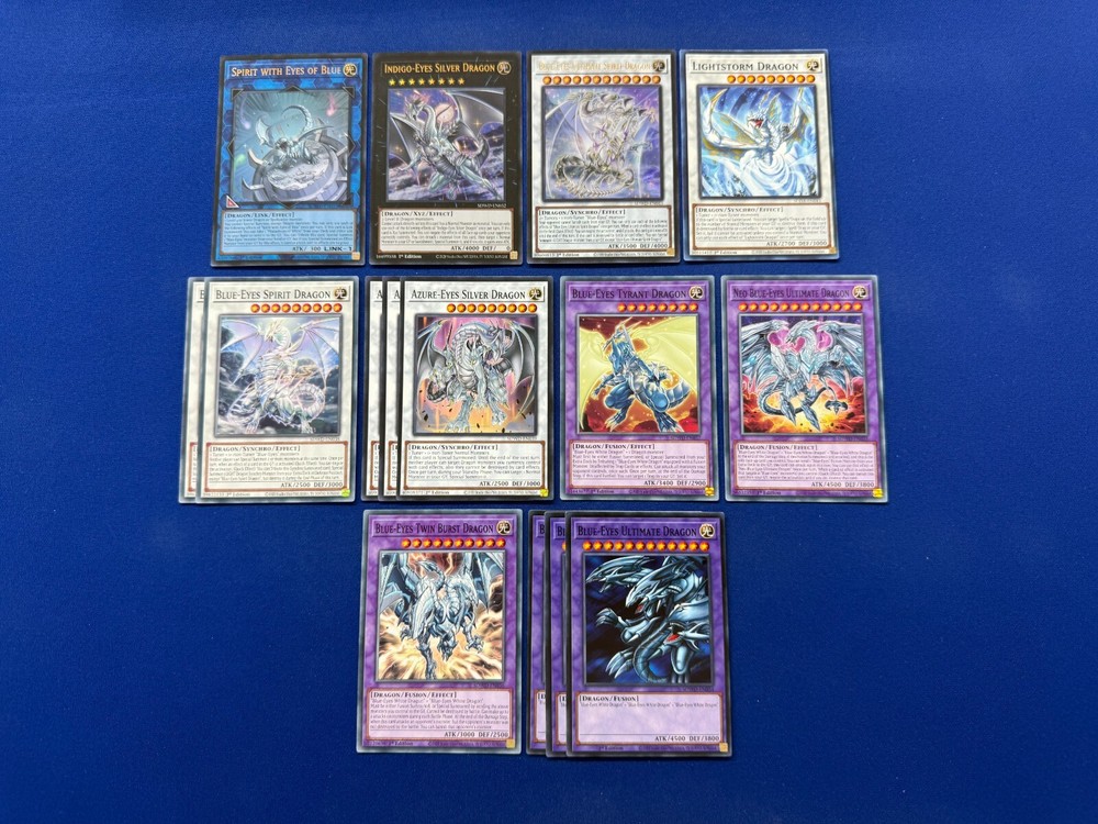 This deck was designed and tested to be ready to play! All cards are in near mint condition (Small chance of lightly played when older cards are involved). By purchasing this item you will receive the following cards: Extra Deck (x15): Spirit with Eyes of Blue (x1) - Ultra Rare Indigo-Eyes Silver Dragon (x1) - Ultra Rare Blue-Eyes Ultimate Spirit Dragon (x1) - Ultra Rare Lightstorm Dragon (x1) - Common Neo Blue-Eyes Ultimate Dragon (x1) - Common Blue-Eyes Twin Burst Dragon (x1) - Common Blue-Eyes Tyrant Dragon (x1) - Common Blue-Eyes Spirit Dragon (x2) - Common Blue-Eyes Ultimate Dragon (x3) - Common Azure-Eyes Silver Dragon (x3) - Common Monsters (x25): Maiden of White (x1) - Ultra Rare Neo Kaiser Sea Horse (x1) - Super Rare The White Stone of Legend (x2) - Common The White Stone Of Ancients (x2) - Common Maiden with Eyes of Blue (x2) - Common Protector with Eyes of Blue (x2) - Common Master with Eyes of Blue (x2) - Common Sage with Eyes of Blue (x2) - Common Rider of the Storm Winds (x2) - Common Kaibaman (x2) - Common Dragon Spirit of White (x2) - Common Blue-Eyes Jet Dragon (x2) - Common Blue-Eyes Abyss Dragon (x2) - Common Blue-Eyes Alternative White Dragon (x2) - Common Blue-Eyes White Dragon (x3) - Common Spell (x12): Wishes for Eyes of Blue (x1) - Ultra Rare Roar of the Blue-Eyed Dragons (x1) - Super Rare Neutron Blast (x1) - Common Mausoleum of White (x2) - Common Beacon of White (x2) - Common Ultimate Fusion (x2) - Common Burst Stream of Destruction (x3) - Common Trap (x3): Majesty of the White Dragons (x1) - Super Rare The Ultimate Creature of Destruction (x1) - Common True Light (x1) - Common Shipping and Handling: Both Domestic and International Shipping are offered. All deck items are shipped via First Class Parcel Service (3-5 Days) and comes with tracking. Priority Mail Service (1-3 days) is also offered for Domestic buyers. Price is calculated based on the buyer's location. Payment: Payments are due within 3 days of ordering. Otherwise an Unpaid Item Case will be opened. If you have any questions or concerns, send a message and we'll answer as soon as we can! Please remember to leave feedbeck if you can, especially if you enjoy your purchase! Thank you for your patronage and support!
