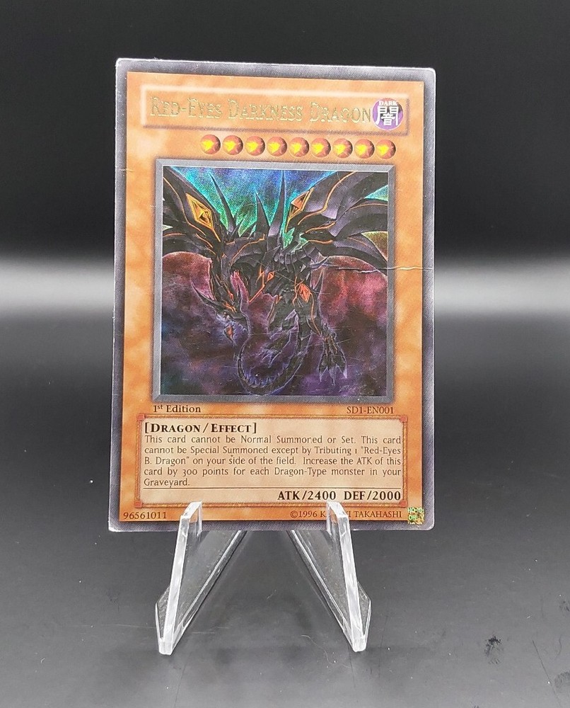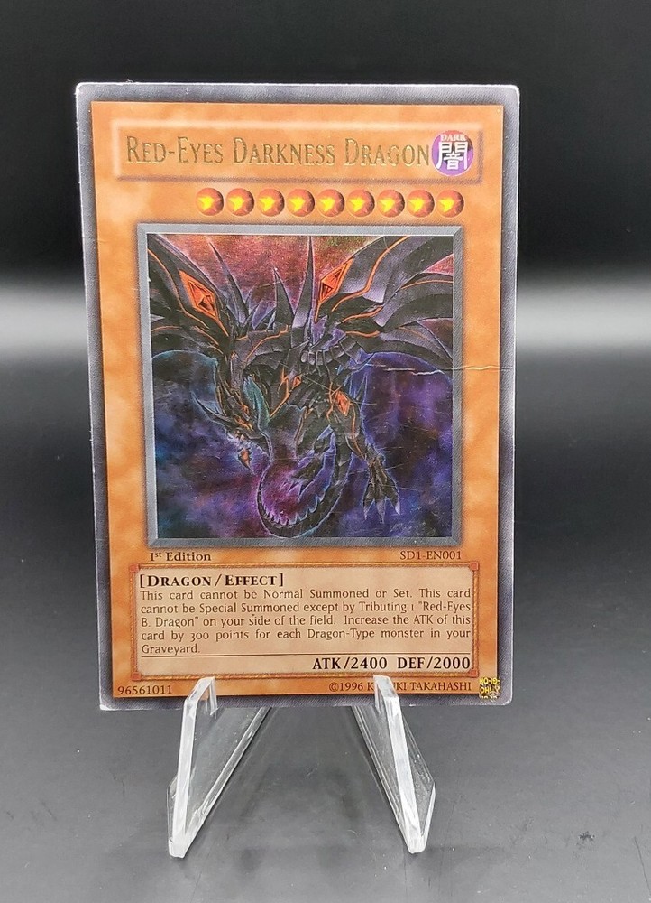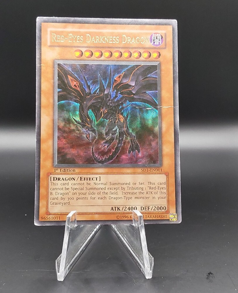 This Yu-Gi-Oh! TCG 2003 Ultra Rare Red Eyes Black Dragon 1st Edition SD1-EN001 HP is a must-have for all collectors. It features a Dark-colored dragon monster type with 2400 attack power and 2000 defense/toughness. The card is heavily played (poor) and manufactured in 1996. It also has a vintage feel to it, making it a great addition to any collection. The card has a holo finish, and its features include being a 1st edition card. This card is perfect for players and collectors alike who appreciate the nostalgic value of this classic card.