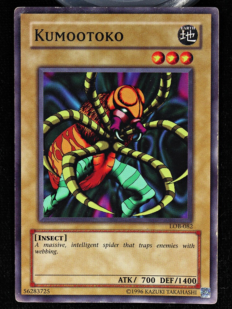 Yu-Gi-Oh! TCG - Legend of Blue Eyes White Dragon - Kumootoko - LOB-082 - Common - Regular LP The card pictured is the EXACT card you will receive. Card will come in a protective penny sleeve. If "STOCK" is in the listing, you will receive a card of the same quality and type, not necessarily the exact card in picture. All card value's $20 and below shipped eBay Standard Envelope with limited tracking.