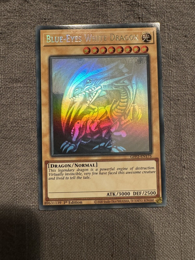 VERY WELL CENTERED This highly collectible Yu-Gi-Oh! TCG card features the iconic Blue-Eyes White Dragon in a Ghost Rare rarity. The card is from the Ghosts from the Past: the 2nd Haunting set and has a card number of GFP2-EN175. It is a Normal card type with a 1st Edition feature, and its card type is Dragon. The card's attributes include a Light color, 3000 attack power, 2500 defense/toughness, and a unique creature/monster type of Dragon. The manufacturer of the card is also Dragon. This card is perfect for fans of the Yu-Gi-Oh! TCG game and collectors alike. Its rarity and unique features make it a highly sought-after addition to any collection. Don't miss out on the chance to add this Blue-Eyes White Dragon card to your collection today.