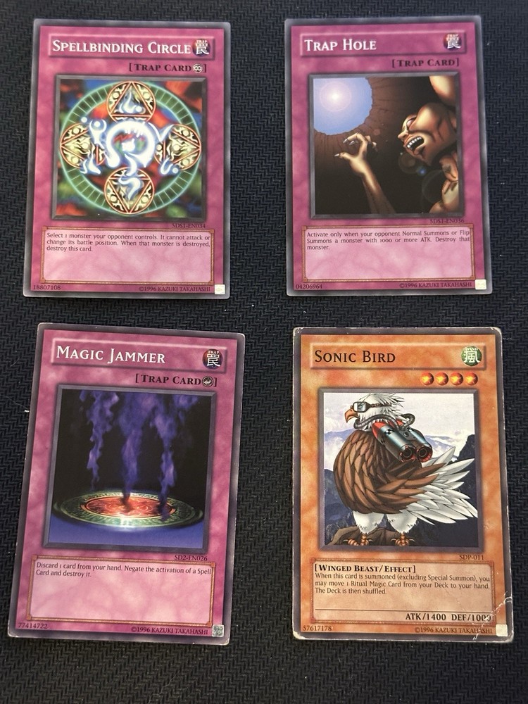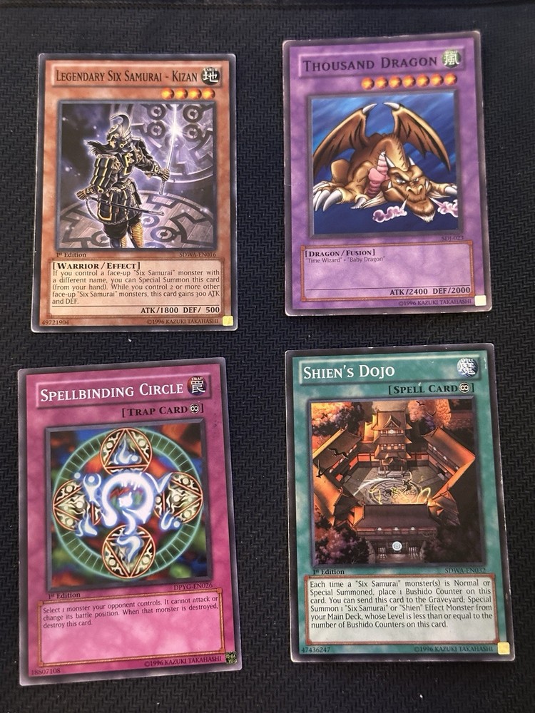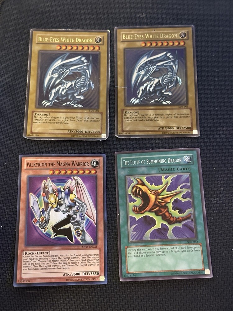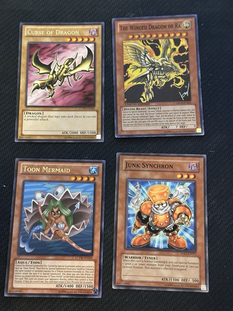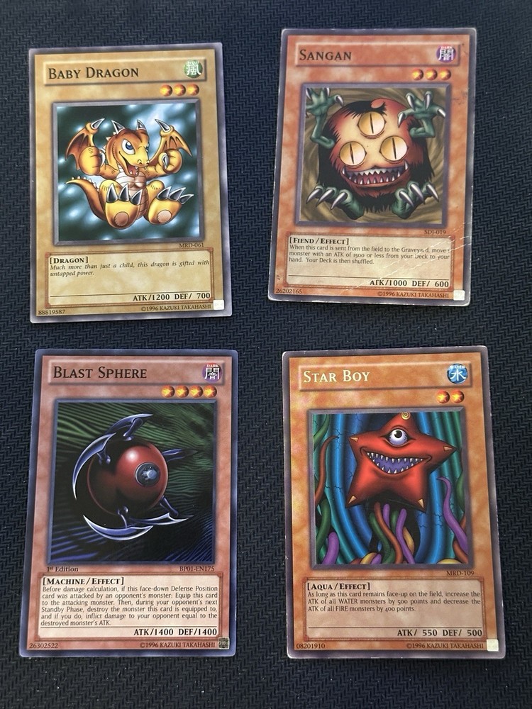 188 card lot with varying condition. The cards were played at one point and some have a bit more damage than others. Overall I would say they are about mid grade cards. Some notable cards include: 2x Blue Eyes White Dragon - played Valkyrion The Magna Warrior Flute of Summoning Dragon Baby Dragon Sangan Blast Sphere - 1st Edition Star Boy Curse of Dragon The Winged Dragon of Ra - Limited Edition Toon Mermaid Junk Synchron Legendary Six Samurai Kizan - 1st Edition Thousand Dragon 2x Spellbinding Circle - one that is 1st Edition Shien’s Dojo - 1st Edition Trap Hole Magic Jammer Sonic Bird