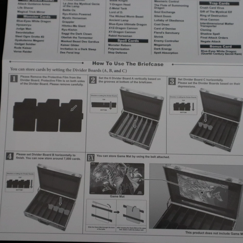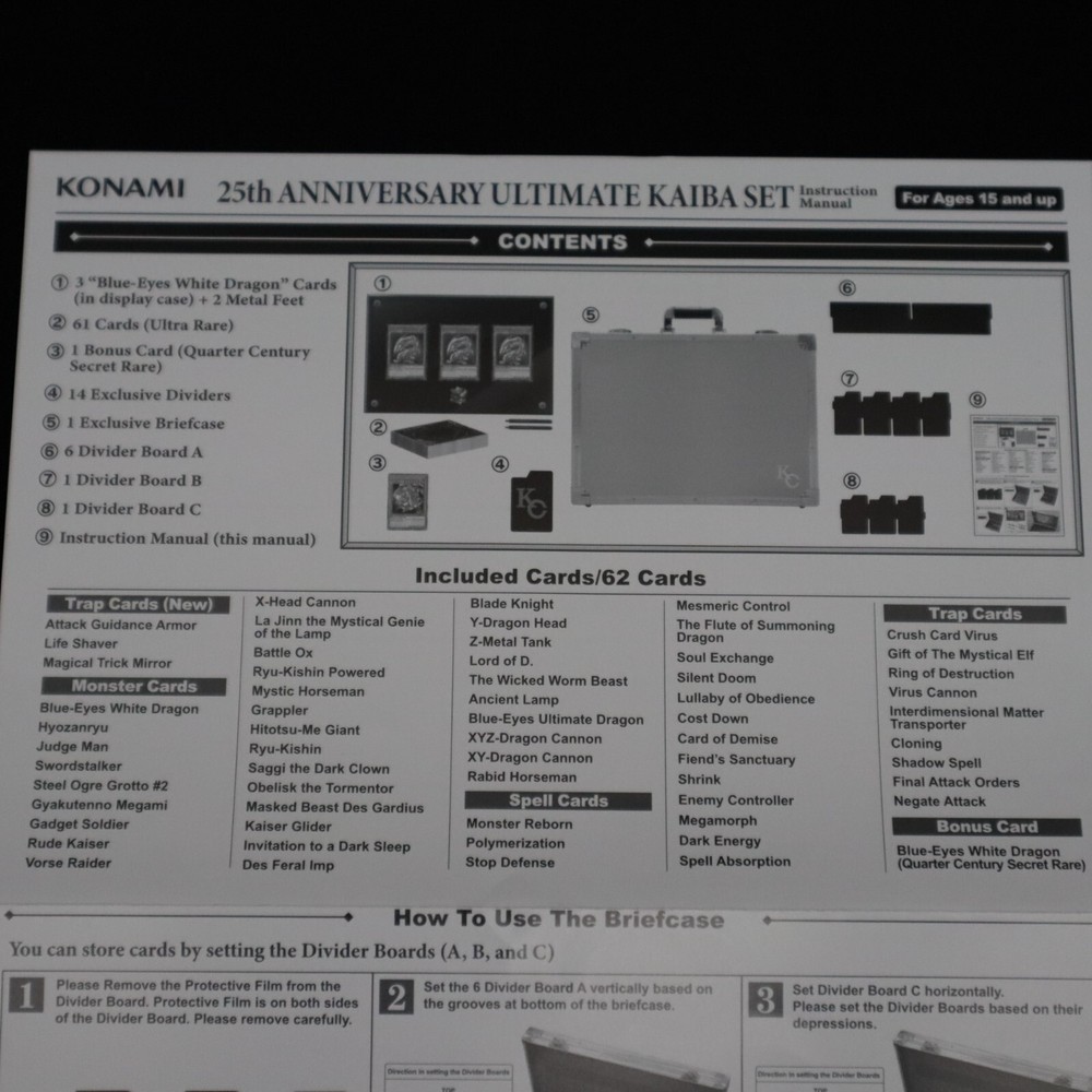 Yu-Gi-Oh! TCG Kaiba Ultimate Set Briefcase English 25th Anniversary Sealed DECK, OPEN CASE TO TAKE PHOTOS ONLY... RARE Each YU-GI-OH! TRADING CARD GAME 25th ANNIVERSARY ULTIMATE KAIBA SET contains the following: * A HEAVY METAL carrying case. VERY heavy. Suitable for display open or closed. The case comes with removable slats to create multiple rows of card-sized storage to hold Decks or collections. Carrying your cards to events in this briefcase (like Mr. Kaiba) will result in quite a workout. Get ready for gains. Be sure to alternate carrying arms to remain biceplaterally symmetrical over time. * Slats and Kaiba Corp. (KC) branded dividers. The slats enable you to build 7 long or 14 short rows for card storage. Several KC-branded dividers are also included to facilitate efficient organization, befitting any well-mannered Duelist. * THREE English version Blue-Eyes White Dragon cards, with the original art, in a solid display case. The display case can be left flat, or attached with feet to stand it vertically. You could take the cards out of the display case for play, if you want. (But why would you?) * THREE of Mr. Kaiba’s cards never available before. You’ve seen Attack Guidance Armor , Life Shaver , and Magical Trick Mirror in his popular adventures. Now you can add them all to YOUR Deck. (All tournament-legal!) * ONE 58-card Ultra Rare Deck of Mr. Kaiba’s most famous other cards. * ONE Quarter Century Secret Rare Blue-Eyes White Dragon cards are NR-MT/MINT or better ,,,THERE ARE NO RETURNS ON UNGRADED OR GRADED CARDS,ASK QUESTIONS You will receive all that is shown in the photos. This item will be shipped inside of a box and/or bub ble mailer that will insure that the item will not be damaged in shipping. $35.00 Shipping Postage Inside United States. HAS TRACKING. EBAY GLOBAL International Shipping CAN NOT COMBINE FOR ONE INVOICE IF YOU WIN BY GLOBAL EBAY SHIPPING, THEY CHARGE FOR EACH WIN YOU GET. AUCTION RULES Please read our terms before bidding or buying. Read the description and understand what you are buying, the quantity and shipping turnaround times for all of our listings. ALL AUCTIONS/BUY IT NOW'S ARE EXPECTED TO BE PAID WITHIN 72 HOURS OTHERWISE A AUTOMATIC PAYMENT REMINDER WILL BE OPENED Shipping and handling charge includes packaging and sealed in a bubble mailer. If more is required to package your item we will take care of it. We will combine shipping when we send invoices. Attention International customers: WE DO SHIP INTERNATIONALLY BUT CAN NOT COMBINE INVOICE UNLESS ITS A USA ADDRESS TO MAIL TO.. ** If you have any questions or concerns, feel free to message us.*