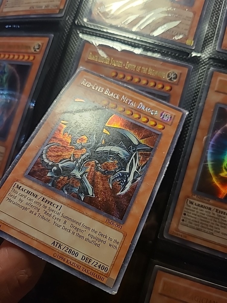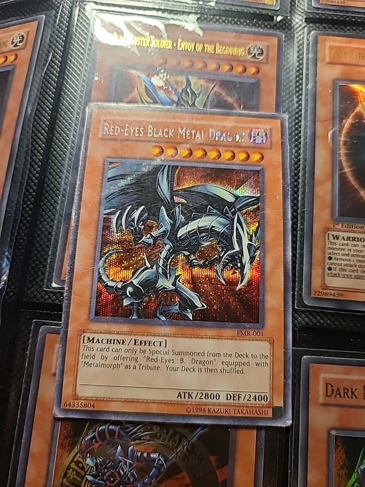 Elevate your card game with this Yu-Gi-Oh TCG Red-Eyes Black Metal Dragon, featuring a stunning prismatic foil finish. This dragon card belongs to the Forbidden Memories Promo set and is a machine/effect type, with a card number of FMR-001. It has been moderately played and is in very good condition, perfect for collectors and players alike. This standard-sized card is made of high-quality cardstock material and bears the manufacturer's mark of Konami. The card is in English language and comes with no autograph. It belongs to the Toys & Hobbies and Collectible Card Games categories, under CCG Individual Cards. Its creature/monster type is a dragon, with a rarity of prismatic secret rare.