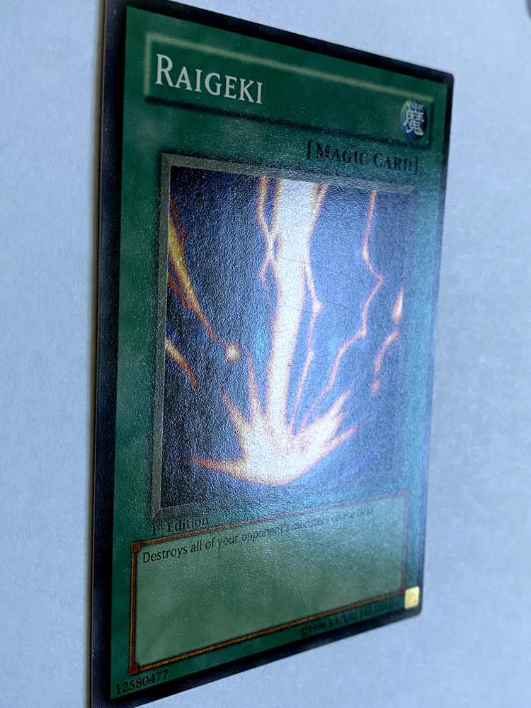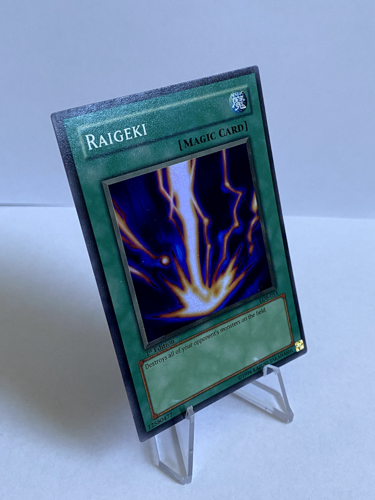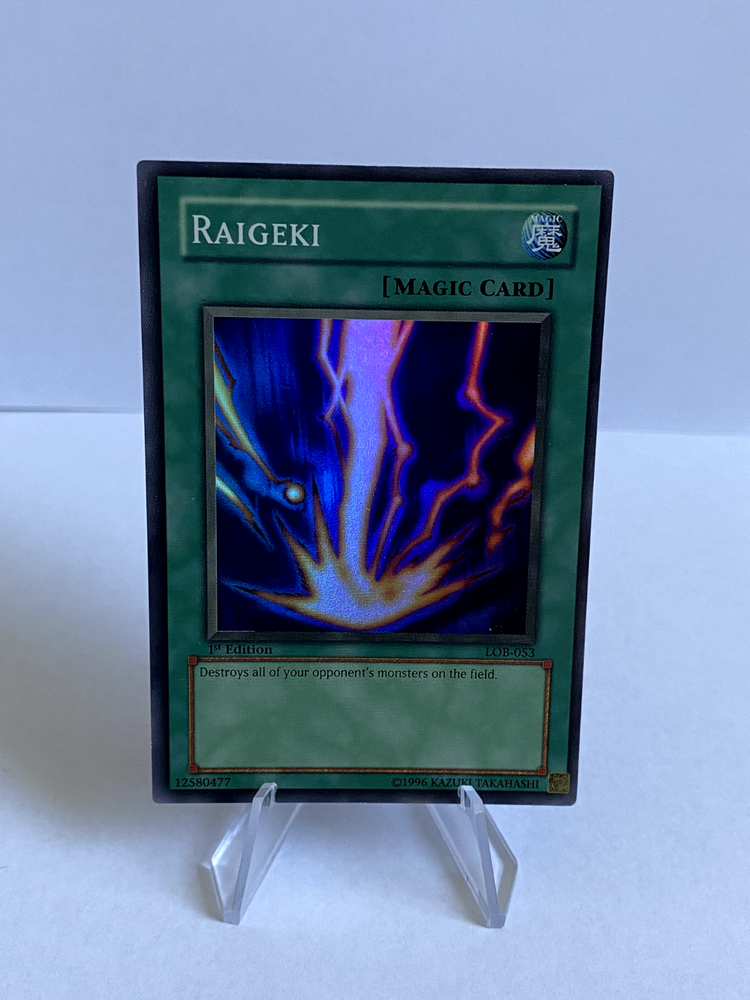 Raigeki LOB-053 1st Edition Super Rare LP Yugioh English. Card is in great condition, generally. Very clean edges and corners. One nick along top edge. Four light scratches on the front surface as pictured. Minor scuff on the back surface. Shipped with USPS Ground advantage.