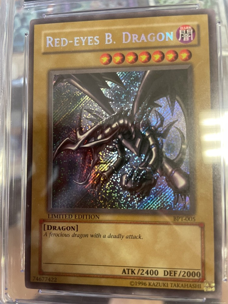 This limited edition Yu-Gi-Oh! TCG card features the iconic Red-Eyes B. Dragon, with a Secret Rare rarity and BPT-005 card number. The card is part of the 20022003 Collector's Tins set, and is a Normal card type with a Dark attribute and Dragon creature/monster type. With a powerful 2400 attack and 2000 defense, this card is a must-have for any serious Yu-Gi-Oh! TCG collector or player. The card also boasts a unique design and is perfect for display or use in competitive play. Don't miss out on the chance to add this rare and sought-after card to your collection!