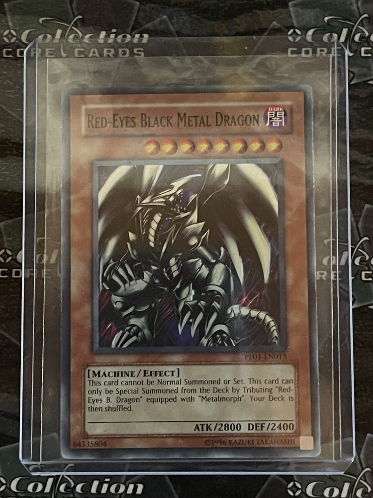 *Topaloader/sleeve included and daily shipping in secure packaging.* The Yu-Gi-Oh! TCG Red-Eyes Black Metal Dragon Premium Pack 1 PP01-EN015 Unlimited card is a Super Rare card that has a dark attribute and a machine creature type. It has a defense/toughness of 2400 and an attack/power of 2800. This Effect card has a card number of PP01-EN015 and is made by Konami.