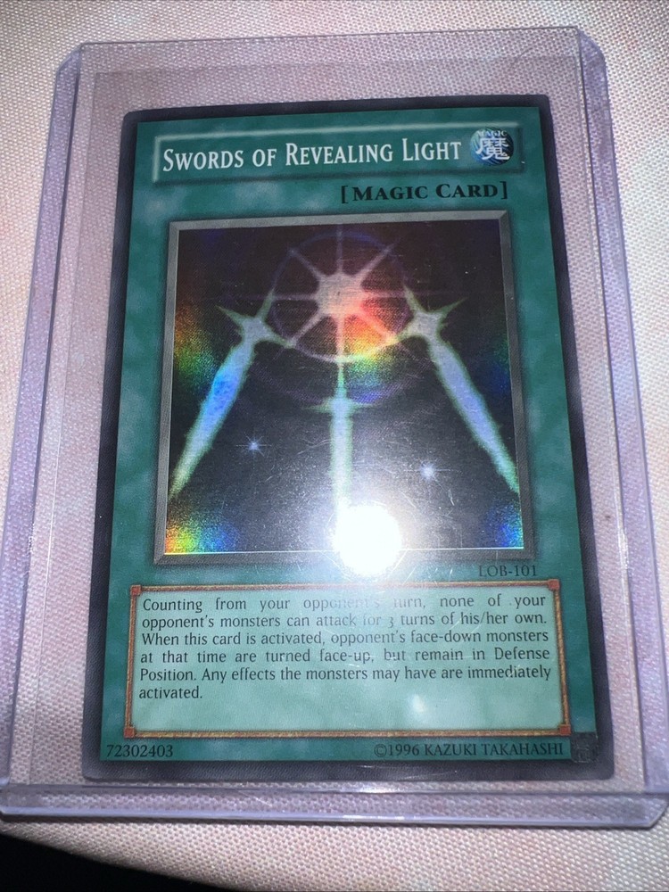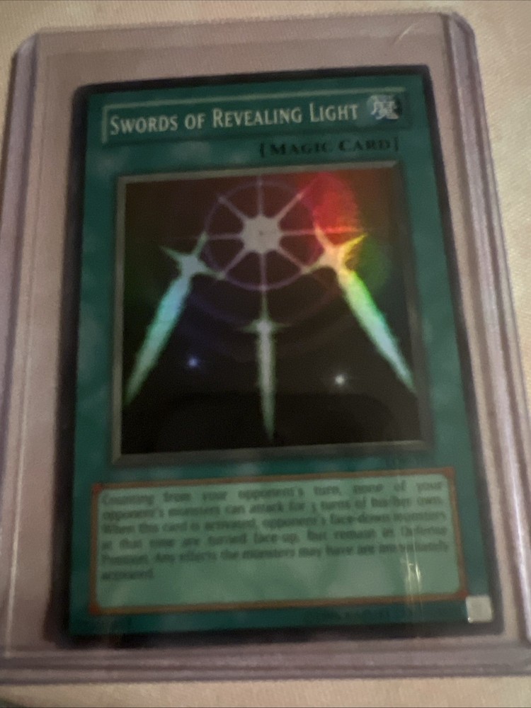 The Yu-Gi-Oh! TCG Swords of Revealing Light card is a Super Rare LEGEND card from the Legend of Blue Eyes White Dragon set. It features a Light Dragon creature type and belongs to the Spell category. Manufactured by Dragon, this card is part of the Unlimited series and has the card number LOB-101. With its special abilities and rarity, this card is a valuable addition to any Yu-Gi-Oh! TCG collection, perfect for fans of the Blue Eyes White Dragon archetype.