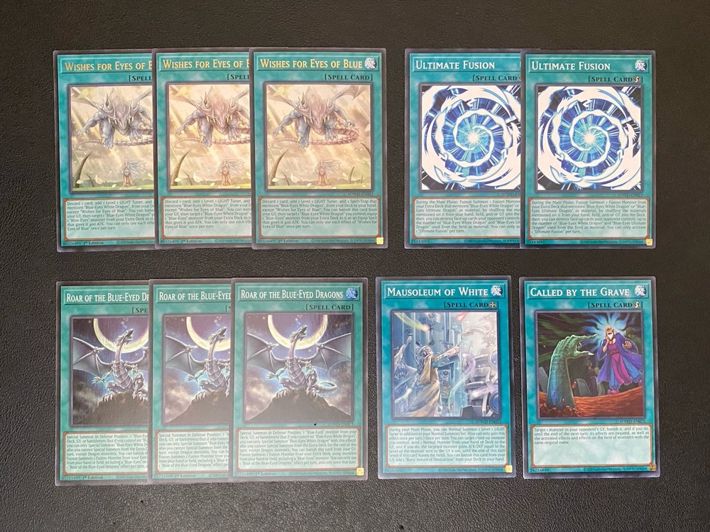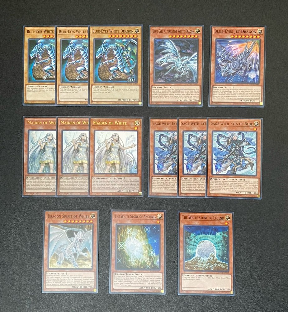 Yugioh Seto Kaiba Blue-Eyes White Dragon Deck. Everything is Near Mint. Extra Deck: 2 Spirit with Eyes of Blue - Ultra Rare Hieratic Seal of the Heavenly Spheres - Common Lyna The Light Charmer, Lustrous- Ultra Rare Knightmare Phoenix - Ultra Rare Knightmare Unicorn - Super Rare Neo Blue-Eyes Ultimate Dragon - Common Blue-Eyes Tyrant Dragon - Common 2 Blue-Eyes Spirit Dragon - Common 2 Blue-Eyes Ultimate Spirit Dragon - Ultra Rare Blackrose Moonlight Dragon - Super Rare Indigo-Eyes Silver Dragon Deck - Ultra Rare Number 38: Hope Harbinger Dragon Titanic Galaxy - Super Rare Monsters: 3 Blue-Eyes White Dragon - Common 3 Maiden of White - Ultra Rare 3 Sage with Eyes of Blue - Common Blue-Eyes Alternative White Dragon - Common Blue-Eyes Jet Dragon - Common Dragon Spirit of White - Common The White Stone of Legend - Common The White Stone of Ancients - Common 3 Effect Veiler - Common 3 Nibiru, The Primal Being - Common 3 Artifact Lancea - Super Rare 3 Ghost Ogre & Snow Rabbit - Ultra Rare Spells: 3 Wishes For Eyes of Blue - Ultra Rare 3 Roar of the Blue-Eyed Dragons - Super Rare Mausoleum of White - Common 2 Ultimate Fusion - Common Burst Stream of Destruction - Common Called By The Grave - Common Traps: Majesty of the White Dragons - Super Rare True Light - Common Side Deck: 3 Ghost Belle & Haunted Mansion - Common 3 Dark Ruler No More - Common 3 Book of Eclipse - Common 3 Cosmic Cyclone - Common 3 Solemn Strike - Rare