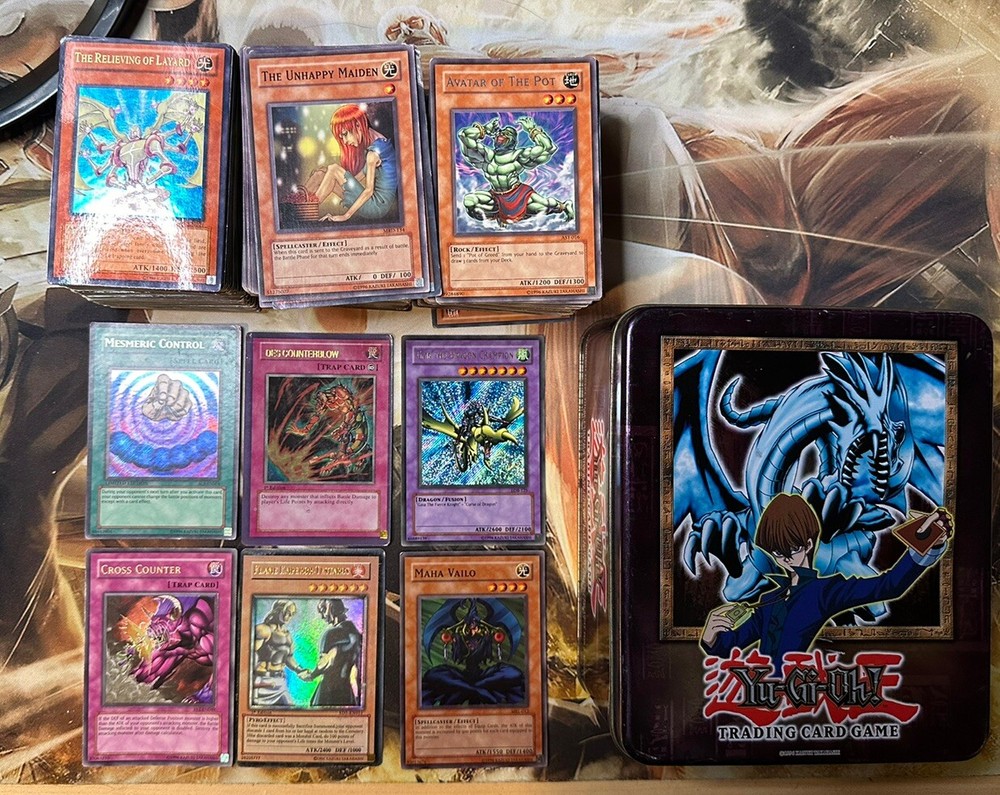 All these cards are played as these are from my childhood. I KNOW NOTHING ABOUT YUGIOH - THAT BEING SAID THERE MAY BE A BUNCH OF FAKE CARDS IN HERE THERES SOME DIFFERENT LOOKING FOILS WITH WEIRD SWIRLS IN THE LOT, THEY ARE SCATTERED IN. I didn’t sort these the foils that are shown were sitting on top. Everything you see you get. Again I can’t stress this enough there may be some fakes in there if you have any questions ask away. I posted a few of what I mean by fake they just look off to me and I have 0 clue what is real vs fake. It’s been well over 20 years with these things lol. This Yu-Gi-Oh! Vintage 1996 Kaiba - Blue Eyes White Dragon Collectors Tin + Cards is a must-have for any fan of the game. The tin includes cards and features a stunning design of the iconic character Kaiba. The item is made of high-quality materials, including tin, and is perfect for collectors and players alike. The set is from 2004 and is manufactured by Konami, a well-known name in the industry. The item is multicolored and comes from an unknown country or region of manufacture. It is vintage and falls under the category of Toys & Hobbies, Collectible Card Games, and Other CCG Items.