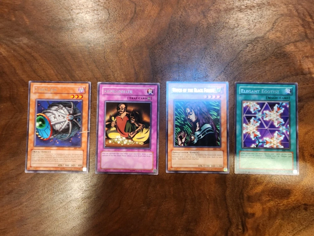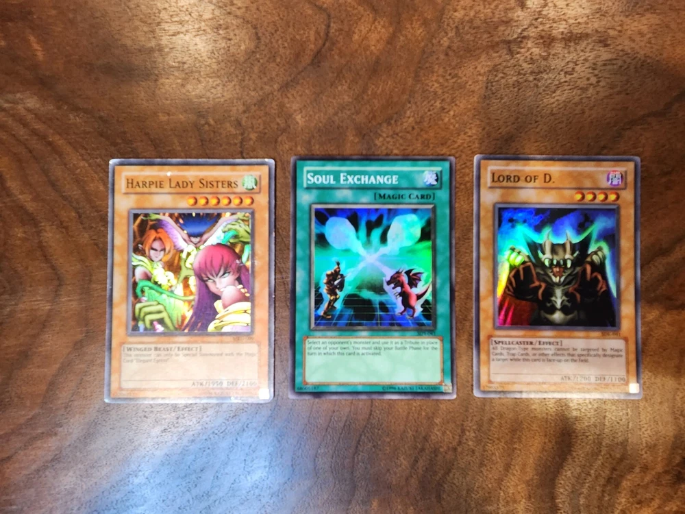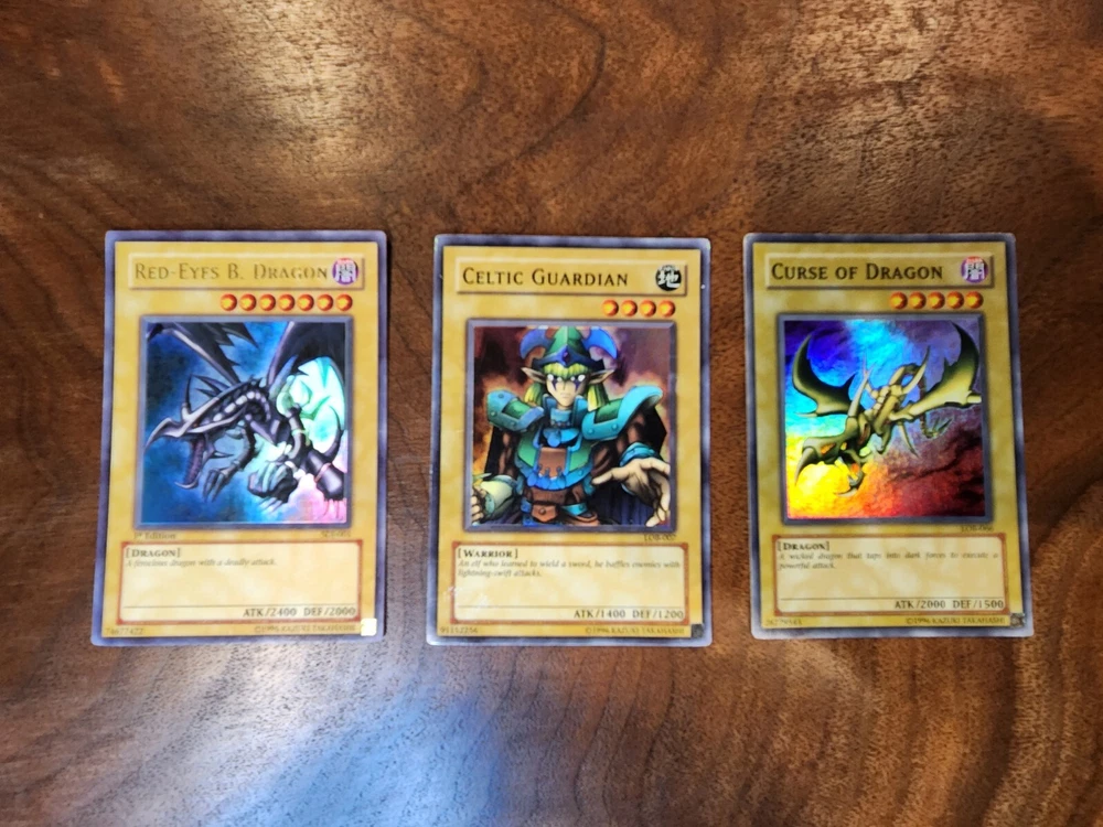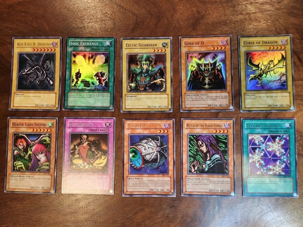 Yugioh 10 Card Lot with Holos and 1st Edition Holo Lot includes cards listed below: (1) Red Eyes B. Dragon 1st Edition Holo (1) Soul Exchange Holo (1) Celtic Guardian Holo (1) Lord of D. Holo (1) Curse of Dragon Holo (1) Harpie Lady Sisters Holo (1) Appropriate (1) Cyber Jar (1) Witch of the Black Forest (1) Elegant Egotist