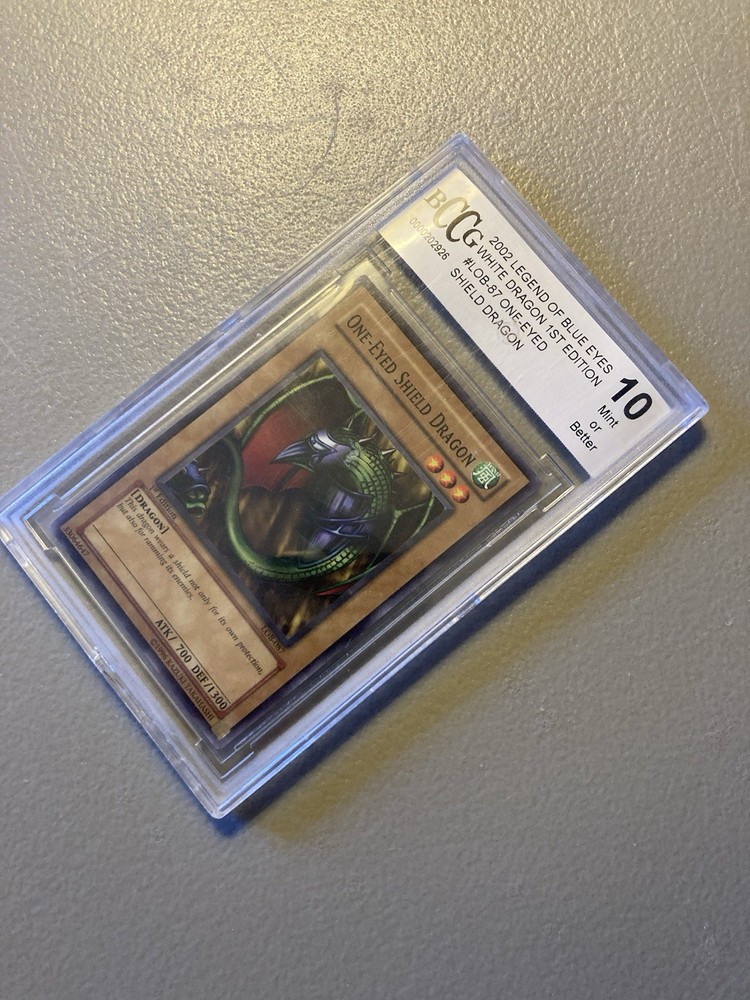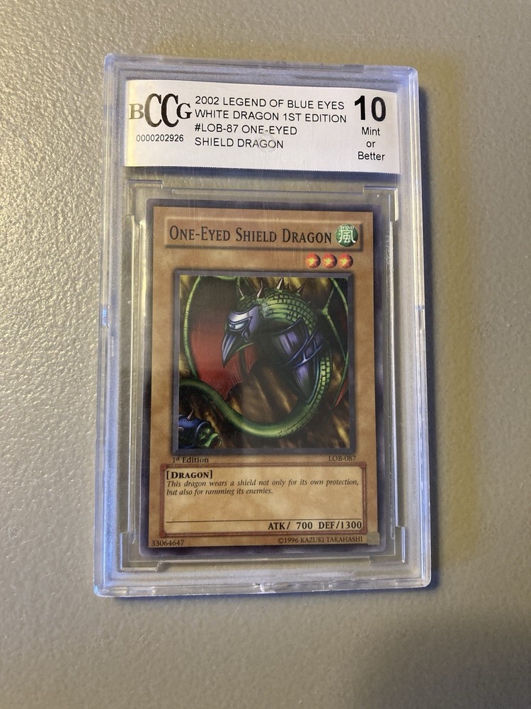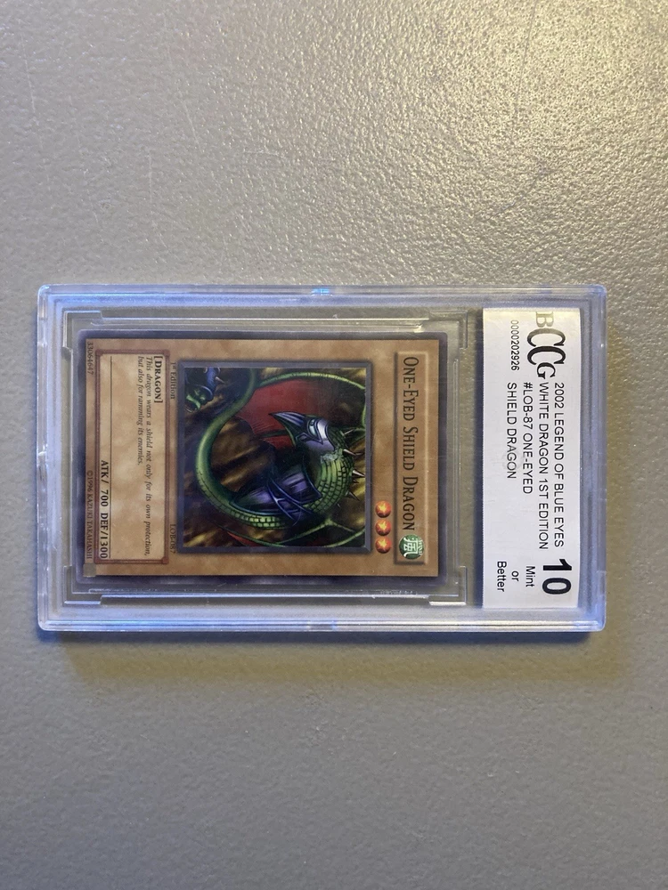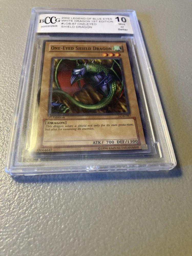 For sale is a Yugioh One-Eyed Shield Dragon LOB-087 BCCG 10 same as PSA 10 First Edition 1st Edition Yugioh The Legend of Blue Eyes White Dragon 1st Edition Graded 10 Mint or Better! Graded 10 BCCG BGS PSA 10 1st Edition Yugioh Card! This is a rare and valuable One-Eyed Shield Dragon card from the Legend of Blue Eyes White Dragon set. This 1st edition card is in near mint condition and has a BCCG 10 rating. The card features a beautiful illustration by Kazuki Takahashi and is a must-have for any Yugioh collector. The card has a cost of 3 and an attack power of 700, with a defense power of 1300. This Common / Short Print card is in English and has a standard card size. The card is perfect for any fan of the Legend of Blue Eyes White Dragon and is a great addition to any collection.