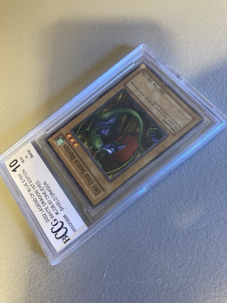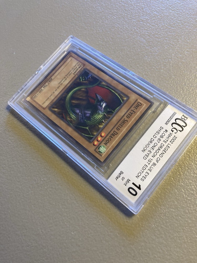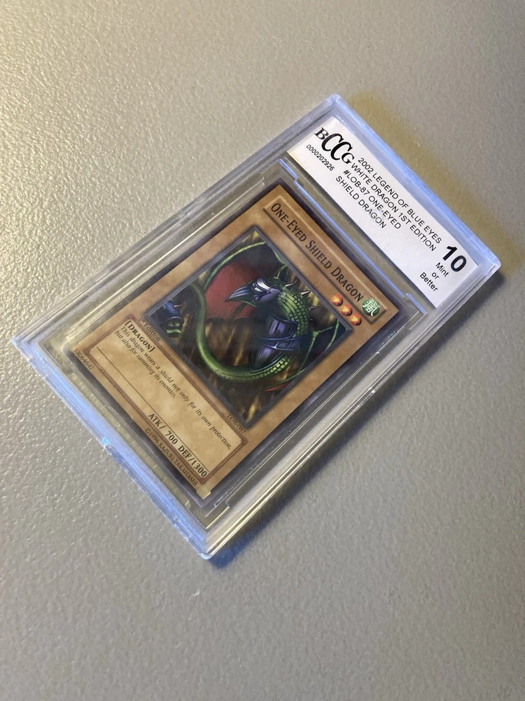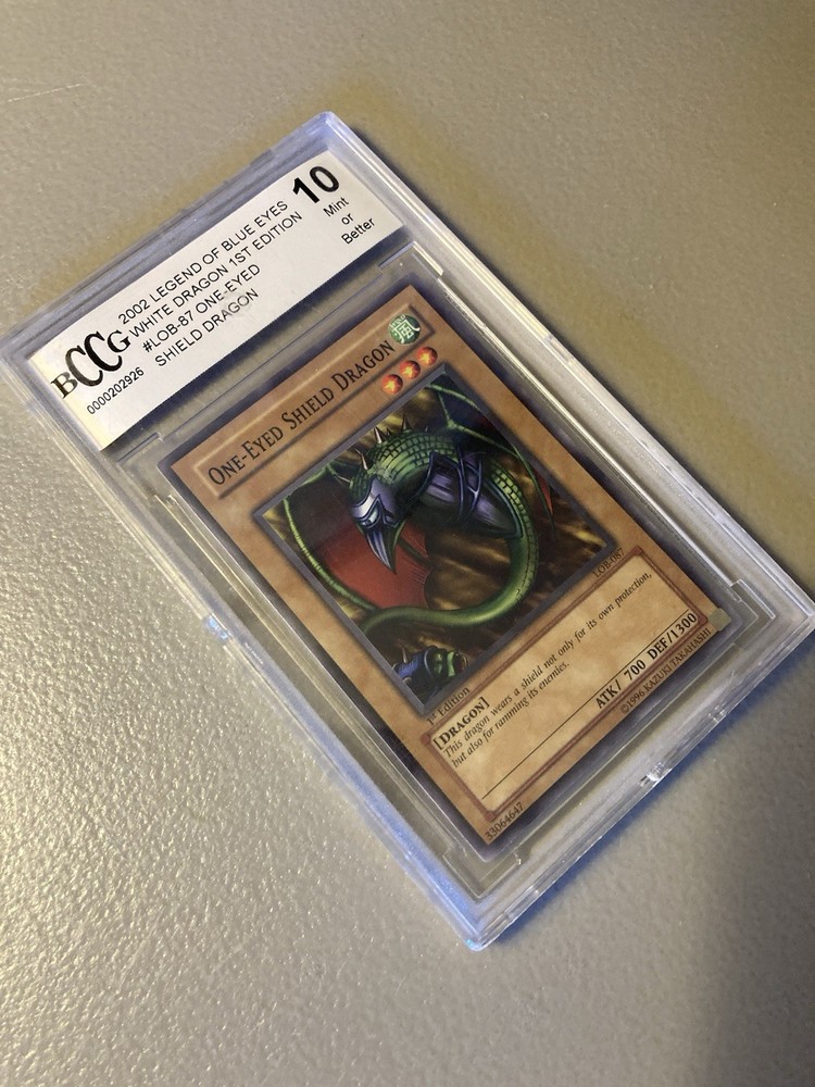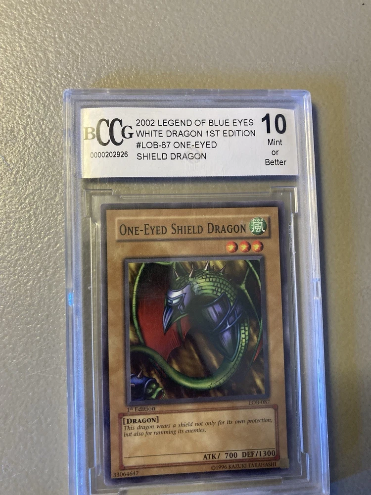 For sale is a Yugioh One-Eyed Shield Dragon LOB-087 BCCG 10 same as PSA 10 First Edition 1st Edition Yugioh The Legend of Blue Eyes White Dragon 1st Edition Graded 10 Mint or Better! Graded 10 BCCG BGS PSA 10 1st Edition Yugioh Card! This is a rare and valuable One-Eyed Shield Dragon card from the Legend of Blue Eyes White Dragon set. This 1st edition card is in near mint condition and has a BCCG 10 rating. The card features a beautiful illustration by Kazuki Takahashi and is a must-have for any Yugioh collector. The card has a cost of 3 and an attack power of 700, with a defense power of 1300. This Common / Short Print card is in English and has a standard card size. The card is perfect for any fan of the Legend of Blue Eyes White Dragon and is a great addition to any collection.