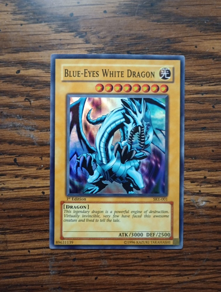 The product is a 2004 1st Edition Blue Eyes White Dragon card from the Yu-Gi-Oh! TCG Kaiba Evolution set. This card features a holographic finish and is in English. It is a highly sought after collectible card for fans of the Yu-Gi-Oh! trading card game. With its iconic design and powerful abilities, the Blue Eyes White Dragon remains a staple card in many Yu-Gi-Oh! decks, making it a valuable addition to any collection. Very slight wear to the bottom two corners of the back of the card but from a far distance there is not much air to it just slight wear from being put in and out of a case from what it looks like to me but I have no card expert but the card is in amazing condition sold as is and returns are not accepted Bonus $20,000 downloadable artwork from William Manier IV since my printer is down when I have ink I will send you a copy free of charge