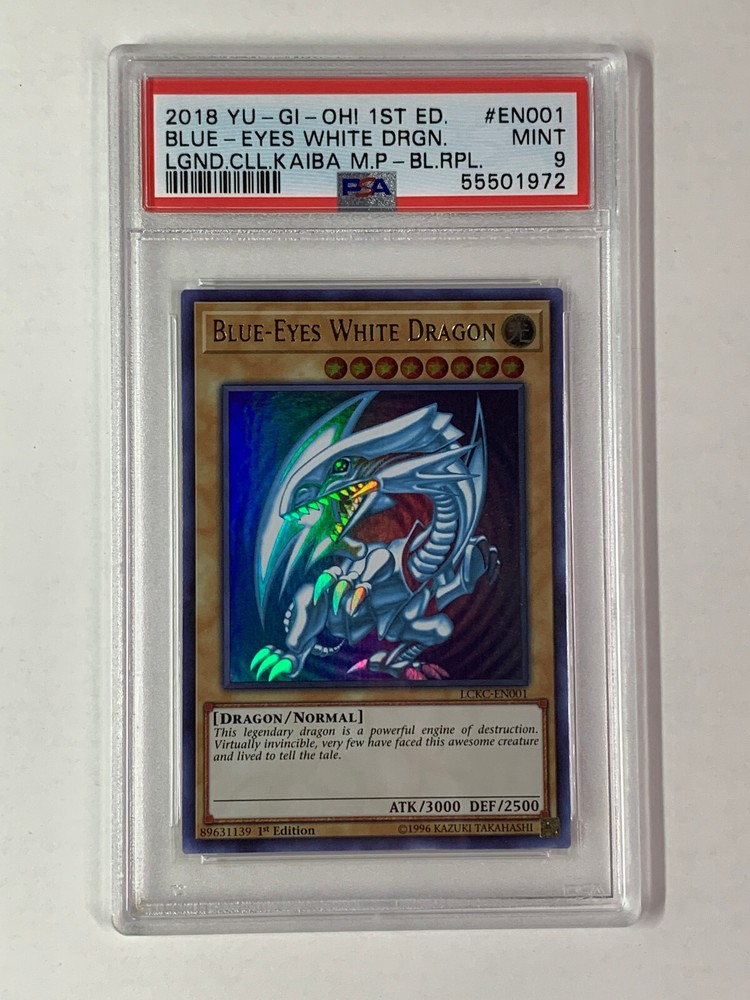 Elevate your Yu-Gi-Oh! TCG collection with the iconic Blue-Eyes White Dragon card, a must-have for enthusiasts and competitive players alike. This 2018 release, with card number LCKC-EN001, boasts the prestigious Ultra rarity and the coveted 1st Edition status, making it a standout addition. Featuring the classic white color scheme and a holographic finish that catches the eye, this card is a product of Konami's meticulous craftsmanship. Graded Mint 9 by the Professional Sports Authenticator (PSA), it ensures both premium quality and authenticity, preserving the card's pristine state for years to come.