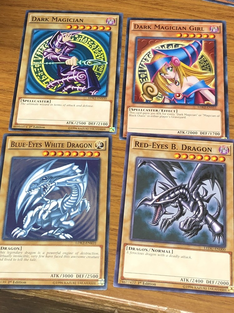 YOU ARE BUYING ONE COPY OF EACH OF THE FOLLOWING CARDS: 1X DARK MAGICIAN 1X RED-EYES B. DRAGON 1X BLUE-EYES WHITE DRAGON 1X DARK MAGICIAN GIRL ALL CARDS ARE ENGLISH AND ARE 100% AUTHENTIC! PLEASE BE A...