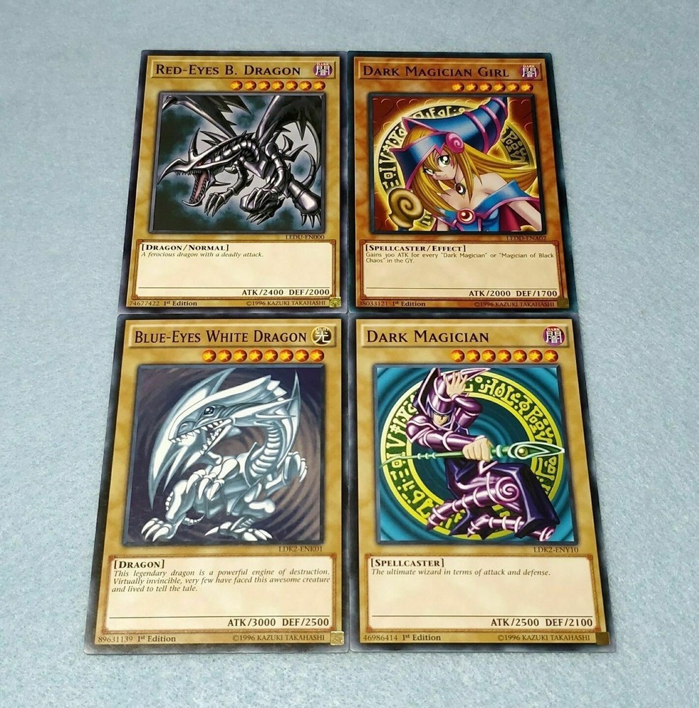 Hello!!! I am a Male Yugioh & Magic Collector & New Ebay Seller!!! I aim for 100% Customer Satisfaction so please!!! Message me about an item if you are not completely Satisfied with it. Below is the featured item if you have any questions please Message me!!! Happy Bidding!!! Picture may have been edited due to Inventory Changes Please read description Below Please Allow me the Set Handling time before your item will be shipped! It may take the full handling time set Thank You!!! Below is the featured item if you have any questions please MSG me!!! Happy Bidding!!! As a Bonus for buying my auction you will Recieve a Free Holo Card from my vast collection. It can be Super Rare, Ultra Rare, or Secret Rare or even GHOST Rare!!! You are bidding on: YOU ARE BUYING ONE COPY OF EACH OF THE FOLLOWING CARDS: 1X DARK MAGICIAN 1X RED-EYES B. DRAGON 1X BLUE-EYES WHITE DRAGON 1X DARK MAGICIAN GIRL ALL CARDS ARE ENGLISH AND ARE 100% AUTHENTIC! PLEASE BE AWARE THAT WE HAVE THESE LOTS PRE-MADE AND THE CARDS ARE NOT GUARANTEED TO BE 1ST EDITION. WE HAVE SOME LOTS CONTAINING UNLIMITED VERSIONS OF THE CARDS.