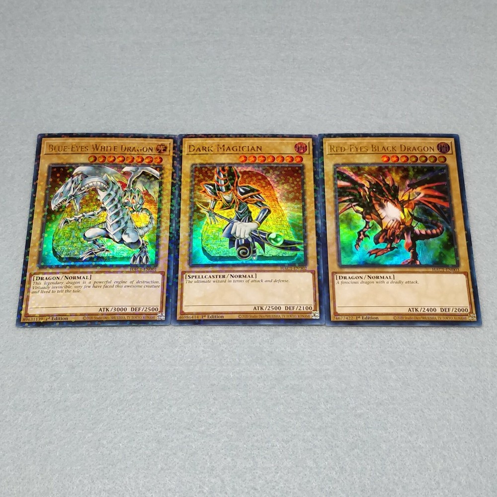 You will receive one copy of each card pictured. Blue Eyes White Dragon (Duel Terminal Ultra Rare) Dark Magician (Duel Terminal Ultra Rare) Red Eyes Black Dragon (Duel Terminal Ultra Rare) They are in near-mint condition.