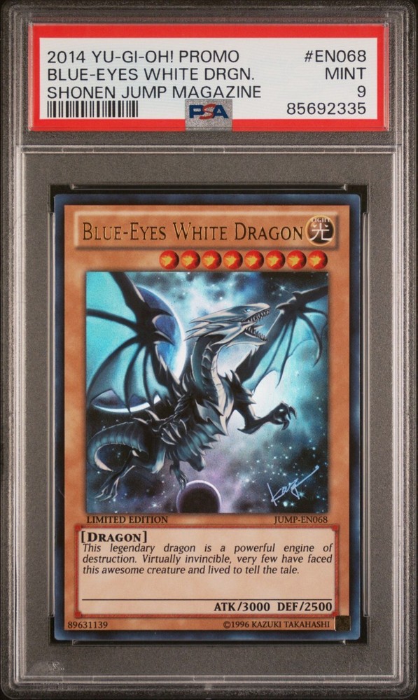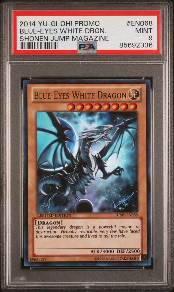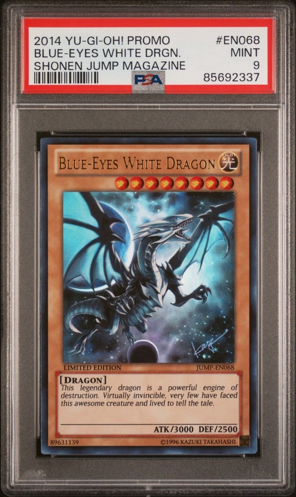 This Blue Eyes White Dragon PSA 9 is a must-have for collectors! The 2014 Jump promo with Kazuki Takahashi's moon artwork looks stunning in mint condition. The grading adds value, and the seller provides tracking for safe delivery. A rare gem for any Yu-Gi-Oh! fan!