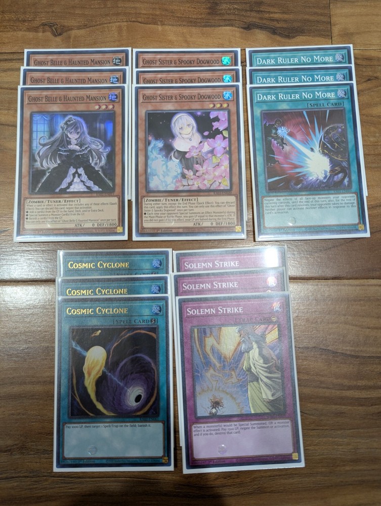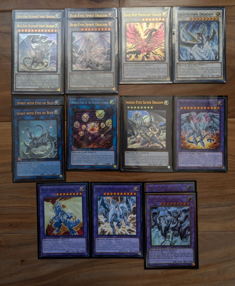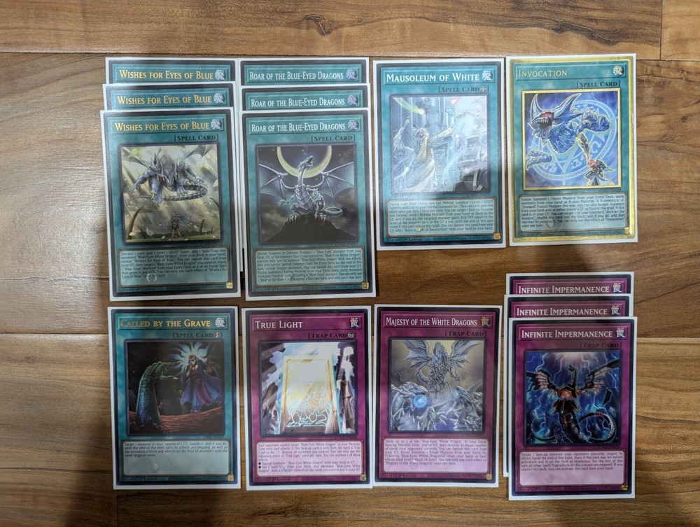 A fully built deck that is ready-to-play competitively straight from the box. Perfect deck for getting back into Yu-Gi-Oh or exploring a new world of dueling! Deck carefully crafted to be playable and competitive against others. Deck follows the post-April 2025 banlist! Cards all come fully sleeved and secure in a deck box to bring style to your duels. All cards are in near mint condition. Blue Eyes White Dragon Items included in the listing: - 1 deck box - 40 sleeved cards for the main deck - 15 sleeved cards for the extra deck - 15 sleeved cards for the side deck (used for swapping cards in-between sets) - 1 Dark Soul Token card - 1 free "Tour Guide From the Underworld" card encased in a top loader to show our appreciation NOTICE: All cards are of common rarity unless specifically mentioned next to card title. Legend: R = Rare, SR = Secret Rare, UR = Ultra Rare Cards within the main deck: - Blue-Eyes White Dragon (Ultra Rare) x2 - Maiden of White (Ultra Rare) x3 - Sage with Eyes of Blue (Common) x3 - Neo Kaiser Sea Horse (Super Rare) x2 - Blue-eyes Jet Dragon (Ultra Rare) x1 - Aleister the Invoker (Alternate Art) (Secret Rare) x3 - Ash Blossom & Joyous Spring (Alternate Art) (Super Rare) x3 - Ghost Mourner & Moonlit Chill (Super Rare) x3 - Effect Veiler (Common) x3 - Nibiru, The Primal Being (Common) x3 - Wishes for Eyes of Blue (Ultra Rare) x3 - Roar of the Blue-Eyed Dragons (Super Rare) x3 - Mausoleum of White (Common) x1 - Invocation (Gold Rare) x1 - Called By the Grave (Ultra Rare) x1 - True Light (Common) x1 - Majesty of the White Dragons (Super Rare) x1 - Infinite Impermanence (Common) x3 Cards within the extra deck: - Blue-Eyes Ultimate Spirit Dragon (Ultra Rare) x2 - Blue-Eyes Spirit Dragon (Ultra Rare) x2 - Black Rose Moonlight Dragon (Ultra Rare) x1 - Lightstorm Dragon (Common) x1 - Spirit with Eyes of Blue (Ultra Rare) x2 - Hieratic Seal of the Heavenly Spheres (Secret Rare) x1 - Indigo-Eyes Silver Dragon (Ultra Rare) x1 - Neo Blue-Eyes Ultimate Dragon (Common) x1 - Blue-Eyes Twin Burst Dragon (Common) x1 - Blue-Eyes Tyrant Dragon (Common) x1 - Invoked Mechaba (Gold Rare) x2 Cards within the side deck: - Ghost Belle & Haunted Mansion (Super Rare) x3 - Ghost Sister & Spooky Dogwood (Alternative Art) (Super Rare) x3 - Dark Ruler No More (Super Rare) x3 - Cosmic Cyclone (Ultra Rare) x3 - Solemn Strike (Super Rare) x3 Feel free to message if you have any questions! Disclaimer: All cards are in near mint condition unless otherwise specified in title or description. This listing consists of only the items mentioned in the description and pictured in the images above. Rarities for cards are as seen in the picture and noted in the description. What you see in the pictures is what you get.