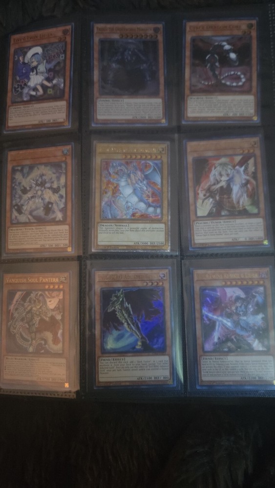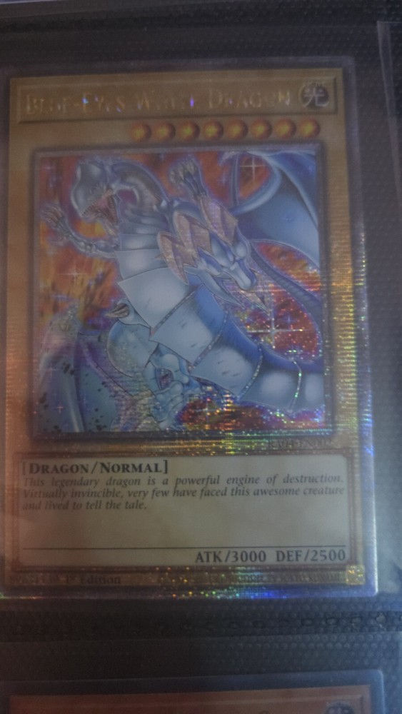 Legendary Blue-Eyes White Dragon card, a first edition QCR! Trading Card Game. This rare find comes with a brand new high quality binder to keep your collection organized and secure. This a QCR 1ST Edition, making it a must-have for any serious collector. Card comes with 77 Ultra rares and Binder shown. ALL cards including Blue Eyes are all unplaid pulled straight from their pack and into penny sleeves! Don't miss out on this opportunity to enhance your collection with one of the most iconic cards in the game. All cards shown in pictures!
