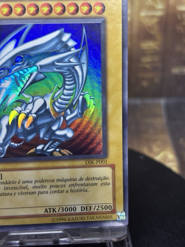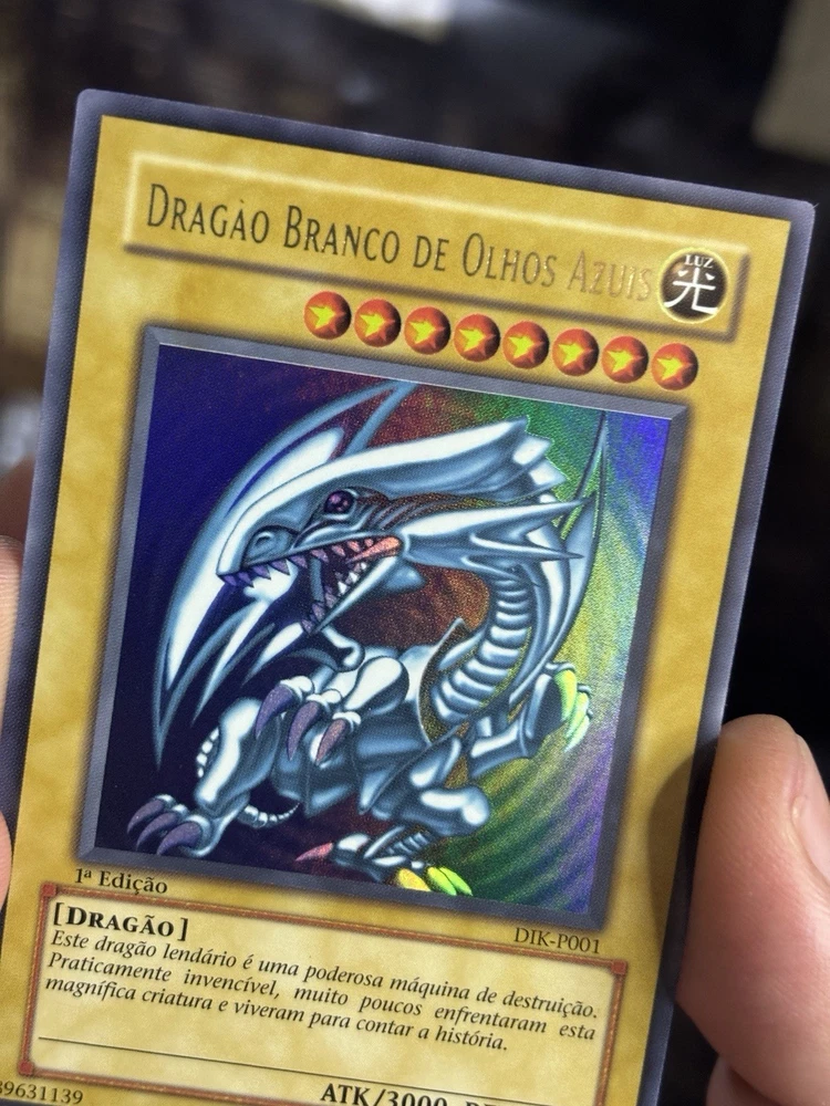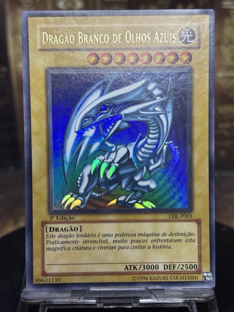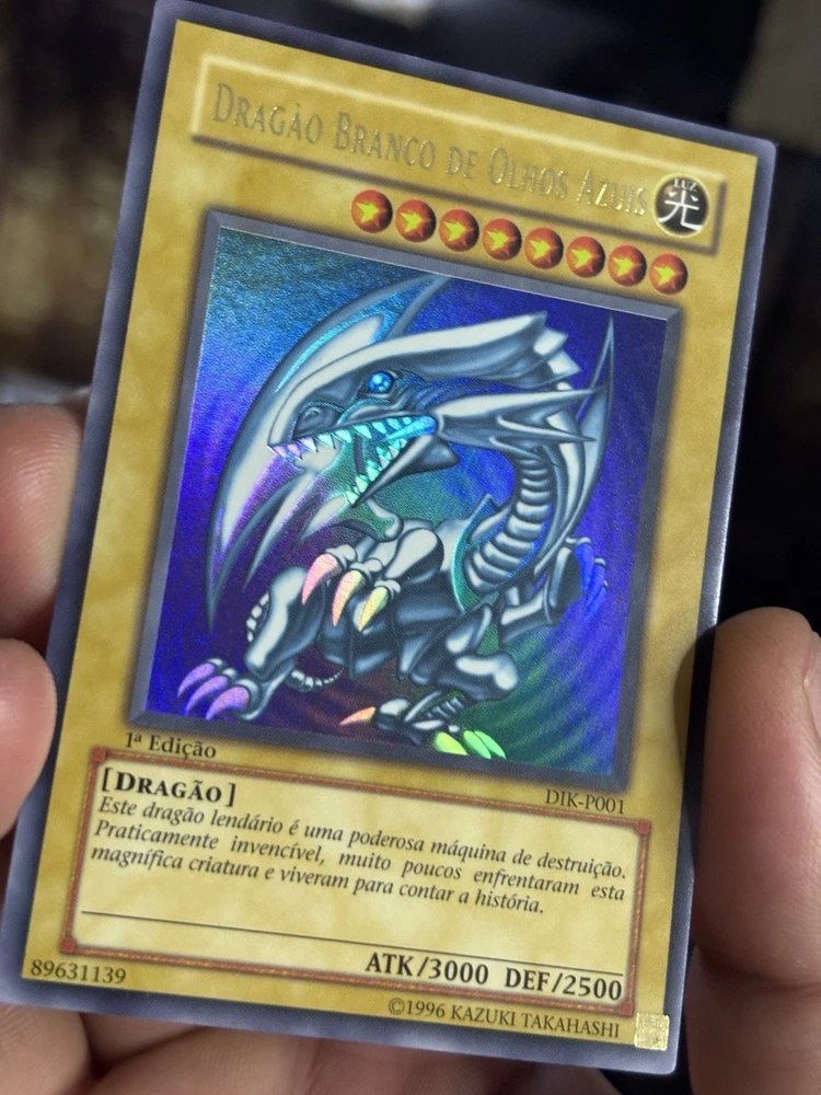 This Yu-Gi-Oh! card is a 1st Edition Blue-Eyes White Dragon with a card number of SDK-001. It features Yami Yugi and Seto Kaiba characters, and is an Ultimate Rare with a card size of Japanese and an attack/power of 3000. The card is made of paperboard material and has a defense/toughness of 2500. It is a Dragon/Effect card with various effect types such as Condition, Summoning condition, and more. This card is perfect for collectors and players of the Yu-Gi-Oh! TCG game. The card is in English language and manufactured by Konami in Japan.