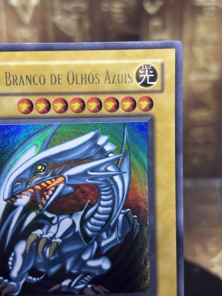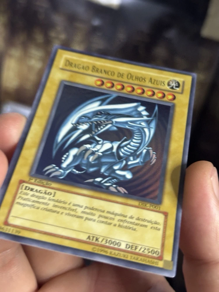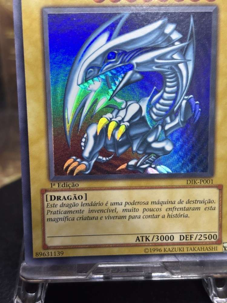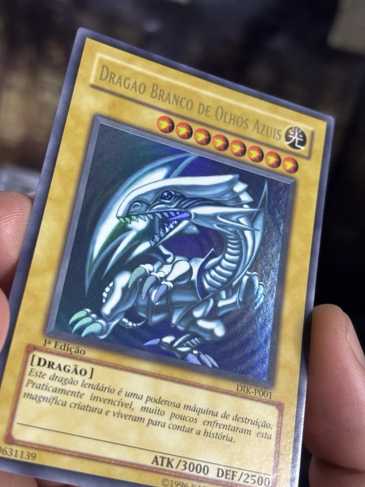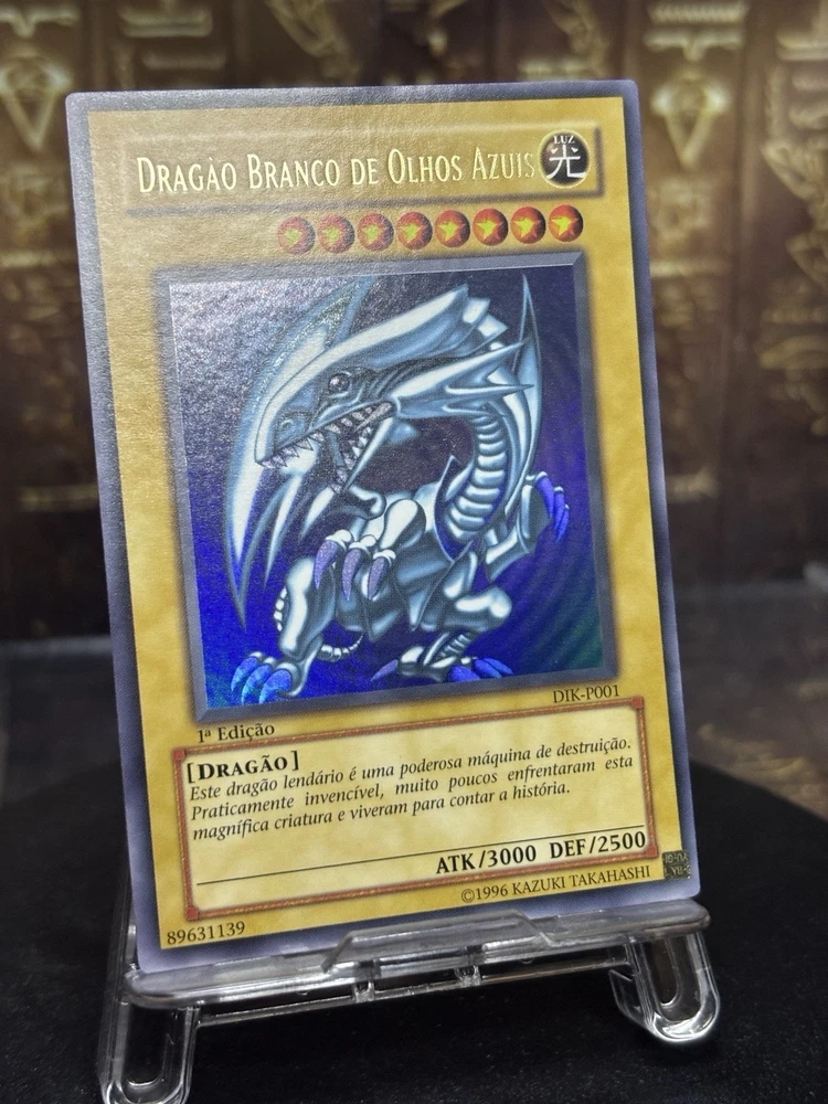 This Yu-Gi-Oh! card is a 1st Edition Blue-Eyes White Dragon with a card number of SDK-001. It features Yami Yugi and Seto Kaiba characters, and is an Ultimate Rare with a card size of Japanese and an attack/power of 3000. The card is made of paperboard material and has a defense/toughness of 2500. It is a Dragon/Effect card with various effect types such as Condition, Summoning condition, and more. This card is perfect for collectors and players of the Yu-Gi-Oh! TCG game. The card is in English language and manufactured by Konami in Japan.