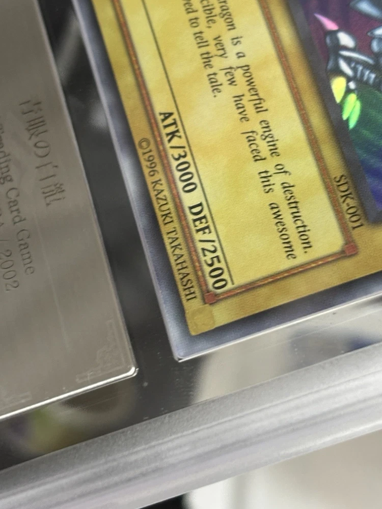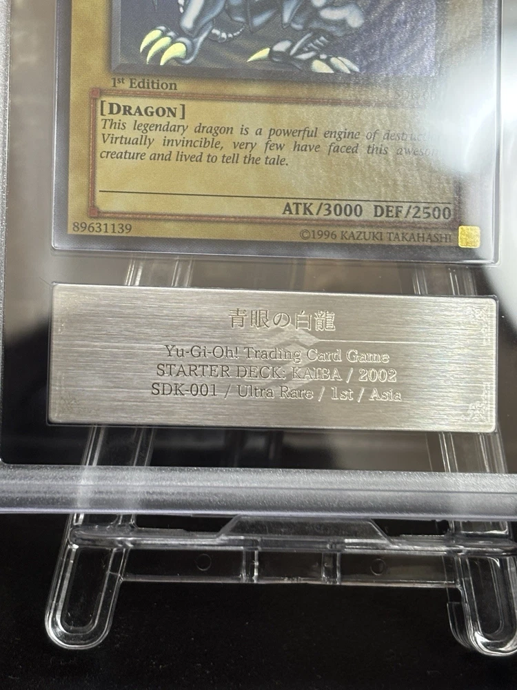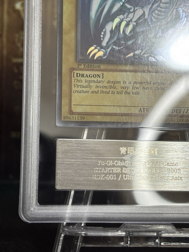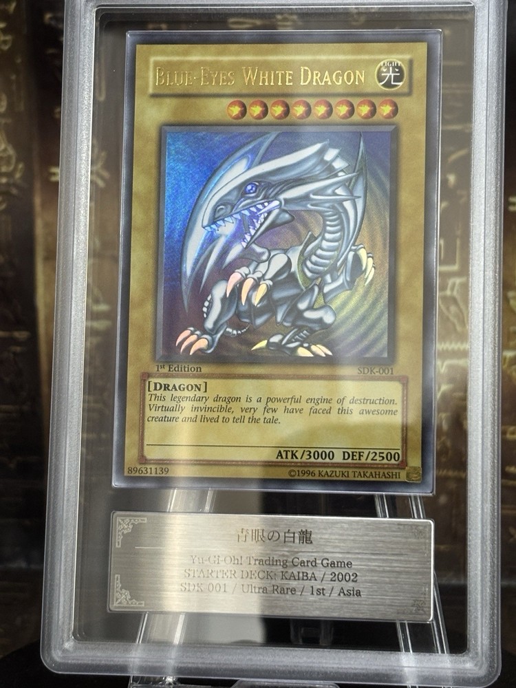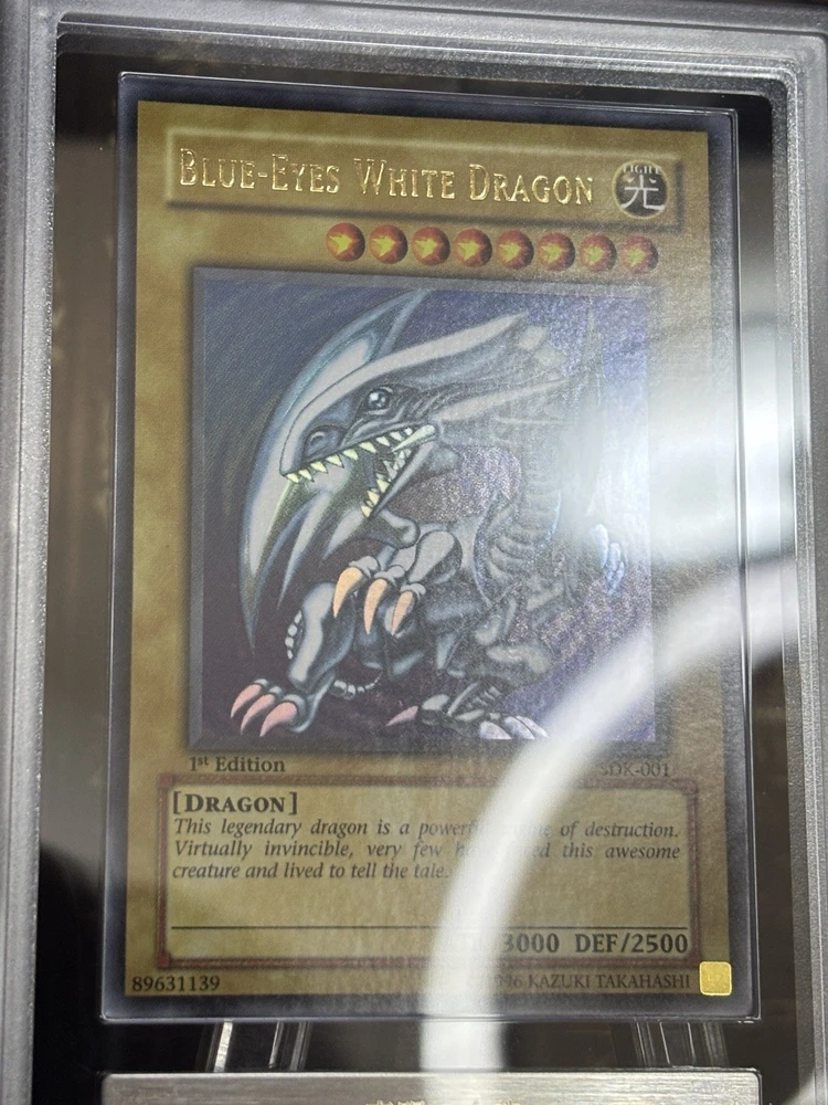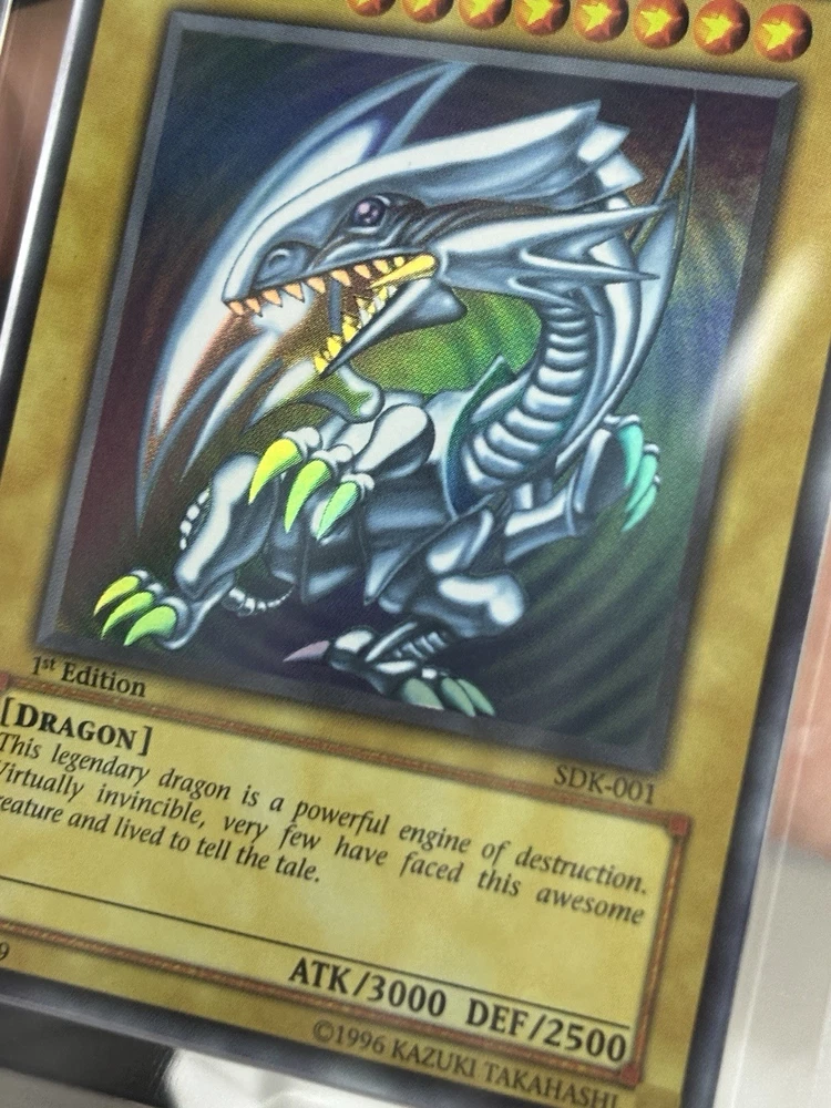 This Yu-Gi-Oh! card is a 1st Edition Blue-Eyes White Dragon with a card number of SDK-001. It features Yami Yugi and Seto Kaiba characters, and is an Ultimate Rare with a card size of Japanese and an attack/power of 3000. The card is made of paperboard material and has a defense/toughness of 2500. It is a Dragon/Effect card with various effect types such as Condition, Summoning condition, and more. This card is perfect for collectors and players of the Yu-Gi-Oh! TCG game. The card is in English language and manufactured by Konami in Japan.
