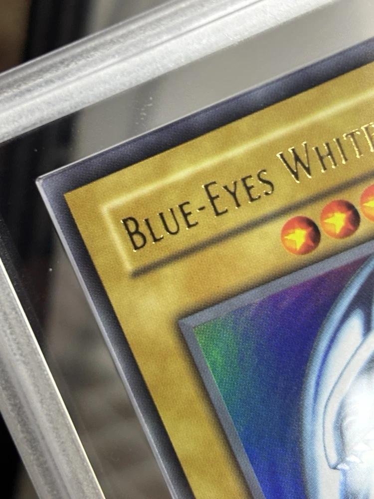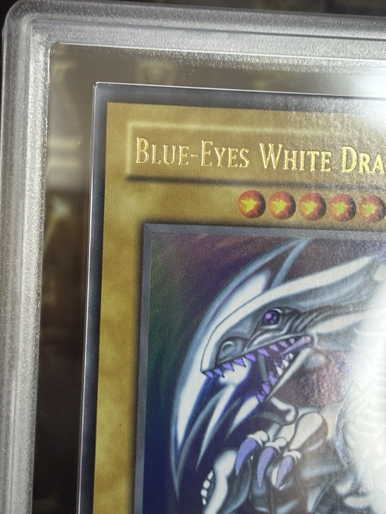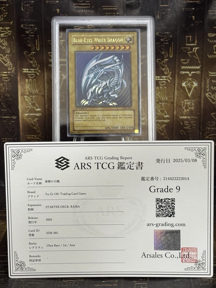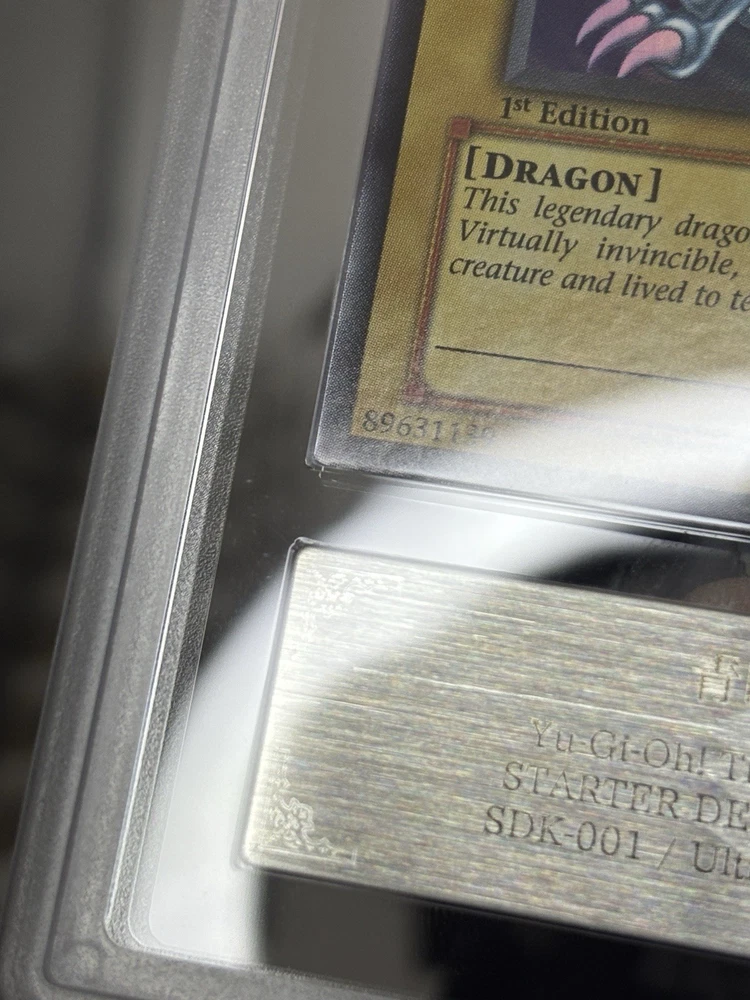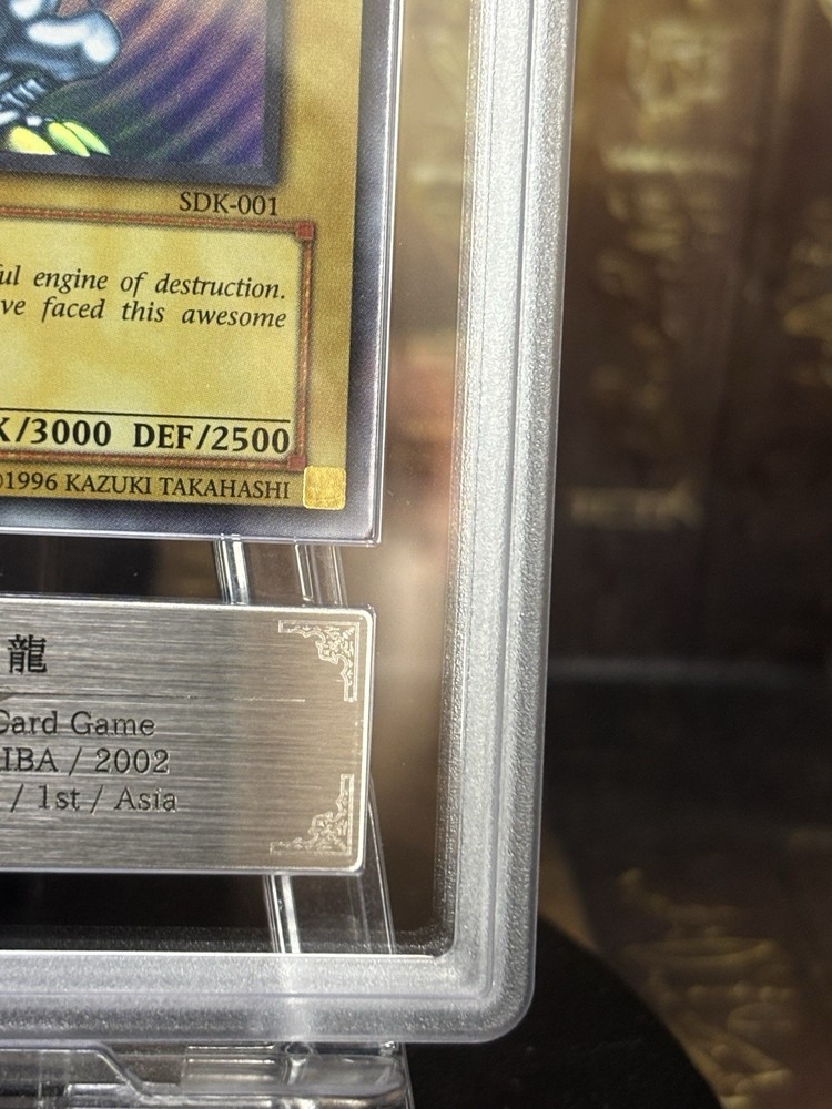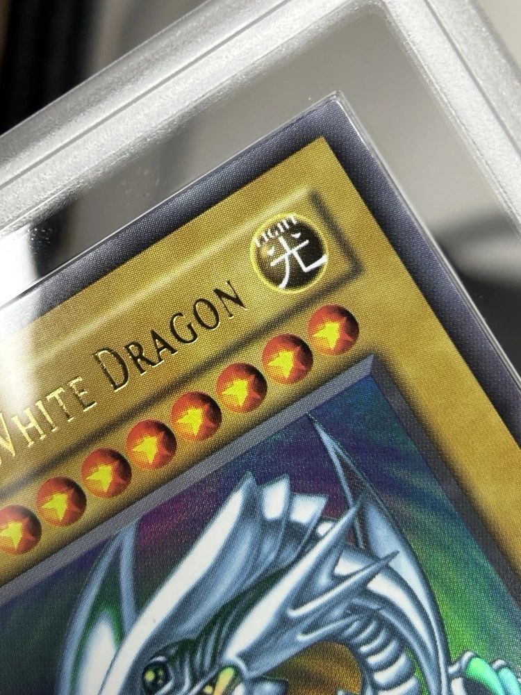 This Yu-Gi-Oh! card is a 1st Edition Blue-Eyes White Dragon with a card number of SDK-001. It features Yami Yugi and Seto Kaiba characters, and is an Ultimate Rare with a card size of Japanese and an attack/power of 3000. The card is made of paperboard material and has a defense/toughness of 2500. It is a Dragon/Effect card with various effect types such as Condition, Summoning condition, and more. This card is perfect for collectors and players of the Yu-Gi-Oh! TCG game. The card is in English language and manufactured by Konami in Japan.