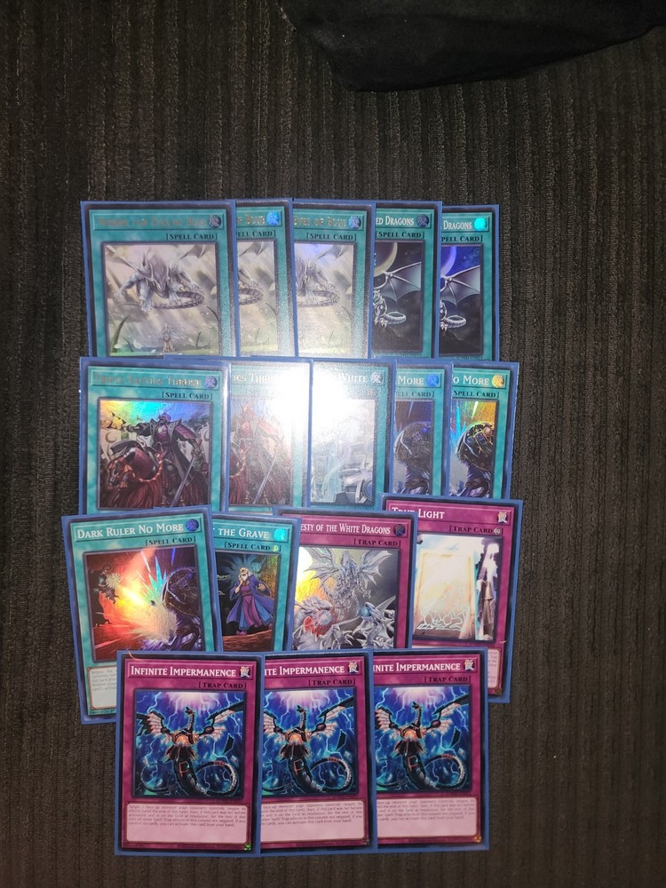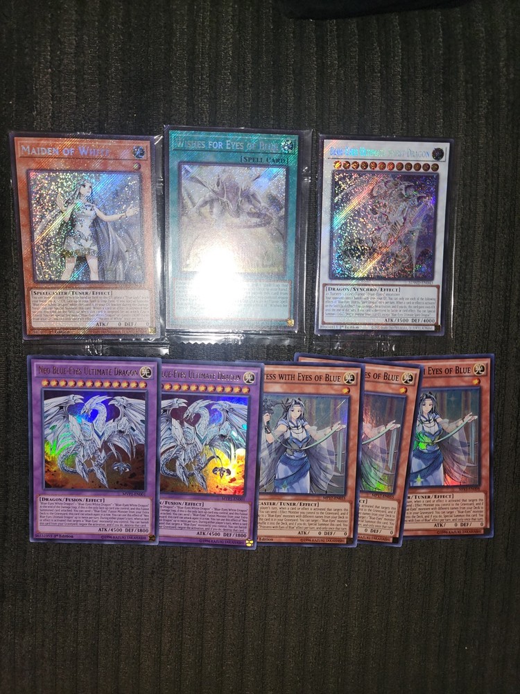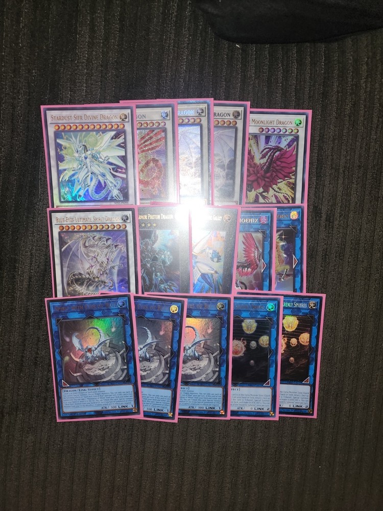 All the cards you see in the pictures is what youll be getting. That also includes the structure deck commons. The key cards here are the stardust sifr dragon, crimson dragon, and the PCR spirit dragon. I also added some blue-eyes upgrades. That means the alternative, abyss, and jet dragons are holo. Let me know if you have any questions. I dont do returns.