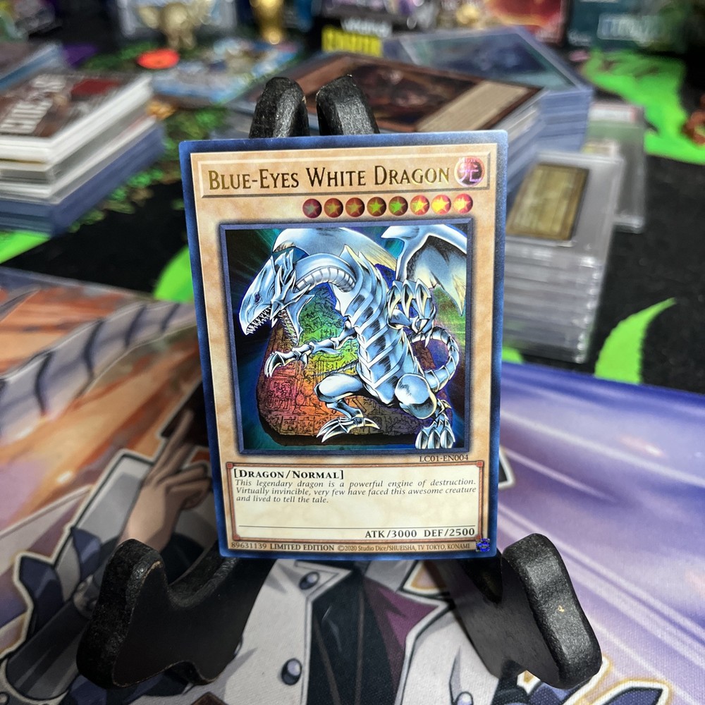 The product is a Yu-Gi-Oh! trading card featuring Seto Kaiba's iconic Blue-Eyes White Dragon. This Limited Edition Ultra Rare card has a Holo finish and is from the Yugi set. It is in near mint or better condition, suitable for collectors and players alike. With its rarity and powerful Dragon creature type, this card is highly sought after by fans of the Yu-Gi-Oh! TCG. Made by Konami, this card is recommended for ages 6 and up.