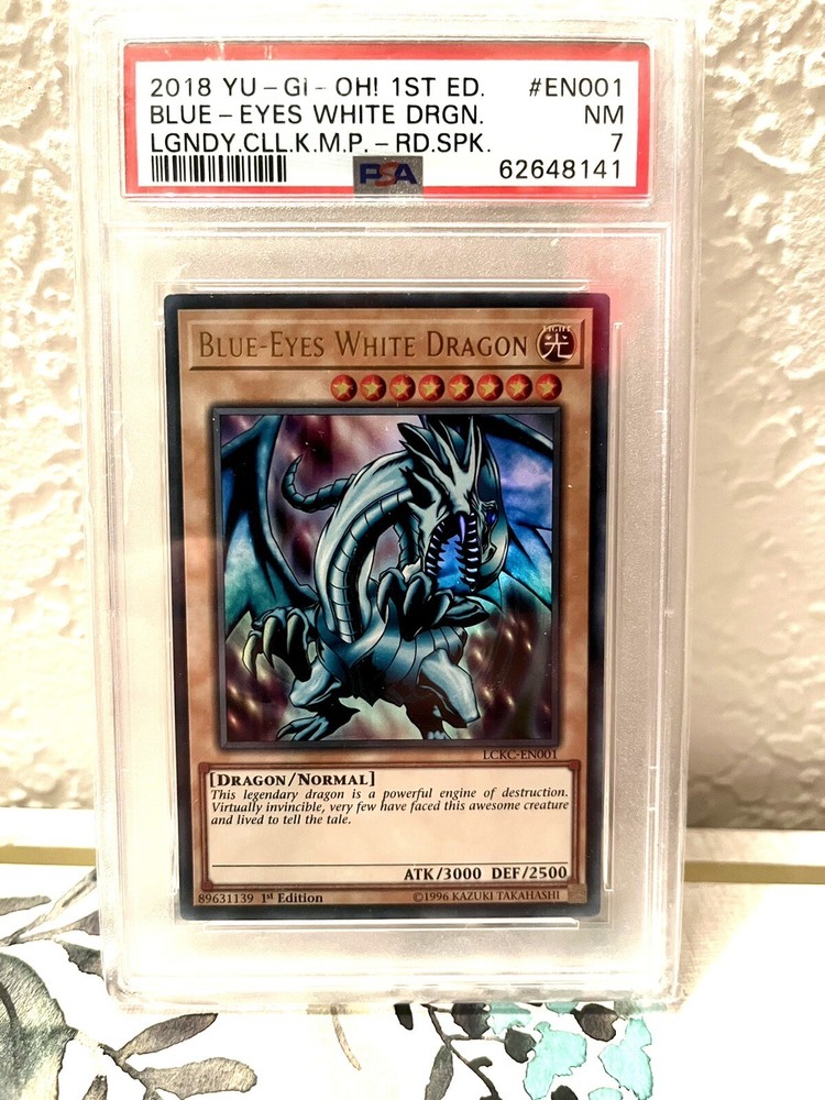 This ultra rare Blue-Eyes White Dragon card from the Yu-Gi-Oh! TCG is a must-have for any collector. With its stunning blue color and iconic design, this card is a great addition to your Legendary Collection Kaiba set. The card is professionally graded by Professional Sports Authenticator (PSA) as a 7, ensuring its authenticity and value. The 1st edition Blue-Eyes White Dragon card features a range of attributes that make it a truly unique item. From its English text and 2018 manufacture year to its CCG Individual Cards category, this card is a rare find. Don't miss the chance to own this highly sought-after card for yourself.