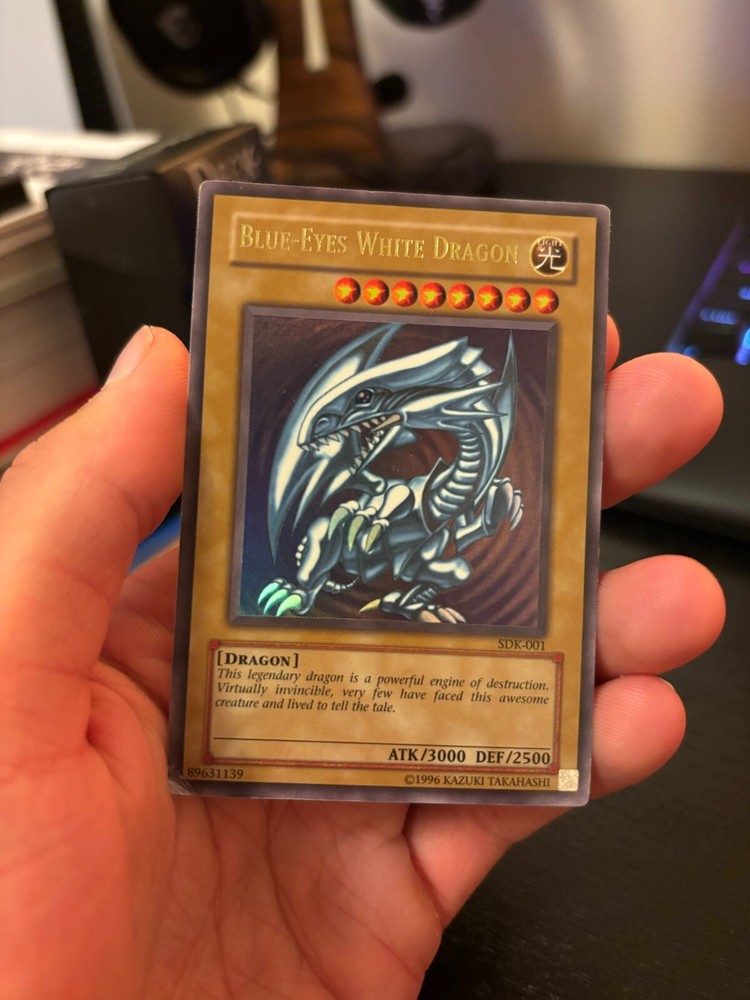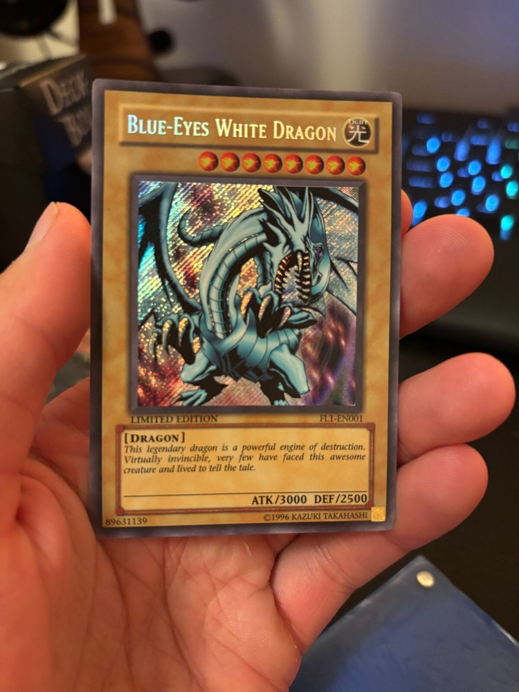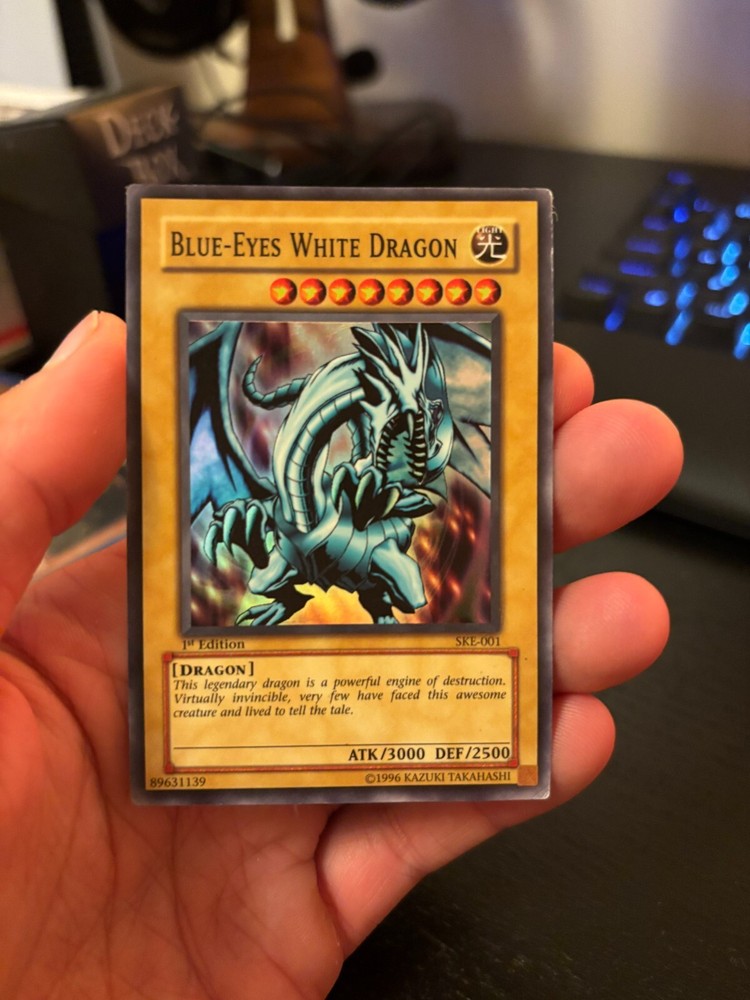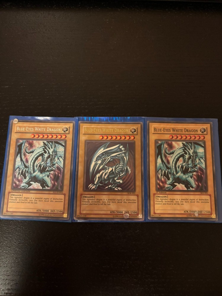 Lot of 3 Blue-Eyes White Dragon Yugioh cards. (SKE-001, SDK-001, and FL1-EN001) The cards have been safely stored in the protective sleeves shown (included with purchase), however, they do exhibit signs of wear and use, please see the pictures for your reference.