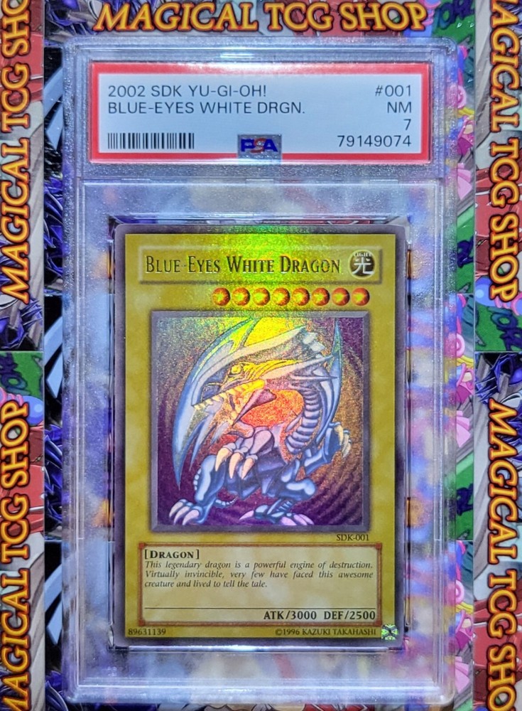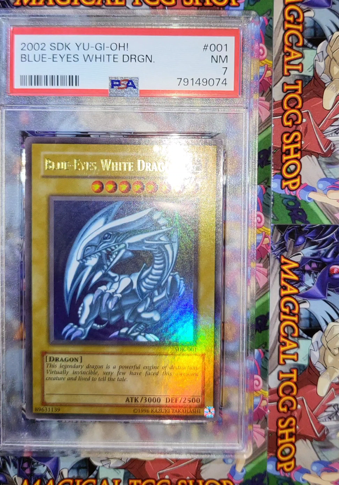 Thank you for taking your valuable time to read my description. You will receive the exact genuine and authentic Yu-Gi-Oh card that you see in the photos for this listing. You are purchasing an Ultra Rare Blue-Eyes White Dragon SDK-001 from the Starter Deck Kaiba set that was released in 2002 by Konami. This card has Holographic Bleed. This card was professionally graded by PSA as Near Mint condition. Please refer to the photos and video for the condition of the card. If you require additional photos, please send me a message and I will provide you with the photos you need. Quality Shipping with maximum protection and it is free! Your order is very important to me, I package each order as if I were going to receive it myself and I know exactly how it feels to receive a damaged item (it is very disappointing). Your card will be handled with extreme care and delicacy. I make it a priority to provide you with the absolute best protection for your purchase. Your card will be inserted into a brand new plastic card sleeve, placed in a new hard plastic top loader, sealed inside of a new plastic team bag, properly set between 2 pieces of hand cut cardboard fit to match the top loader, wrapped in a layer of bubble wrap and mailed in a bubble padded mailer to ensure a safe delivery to your home. Same day Handling! Your order will ship the same business day that you place the order for orders placed before 5:00 PM (Eastern Standard Time) Mon-Fri. Your order will be shipped USPS 1st Class and tracking information is provided with your purchase. If you have any questions, send me a message and I will respond promptly. I appreciate your time, Thank you.