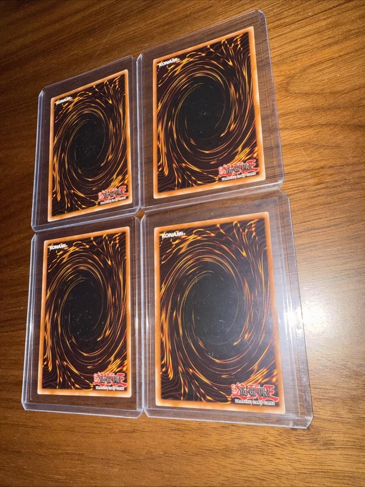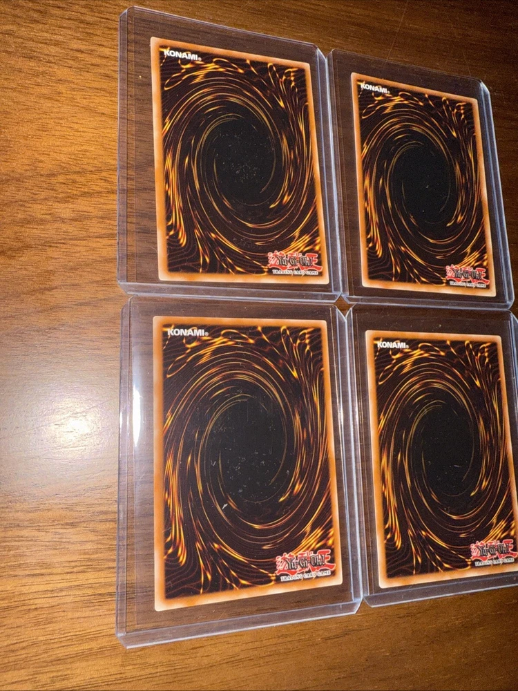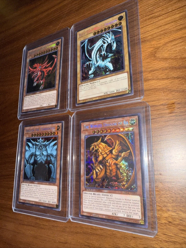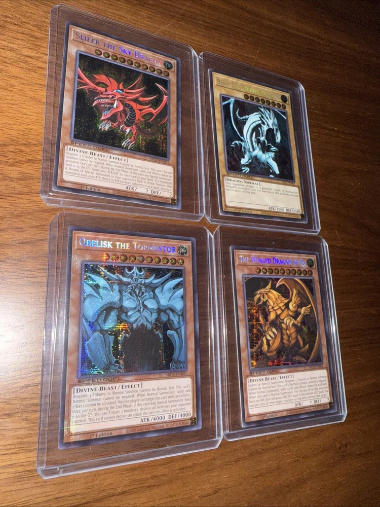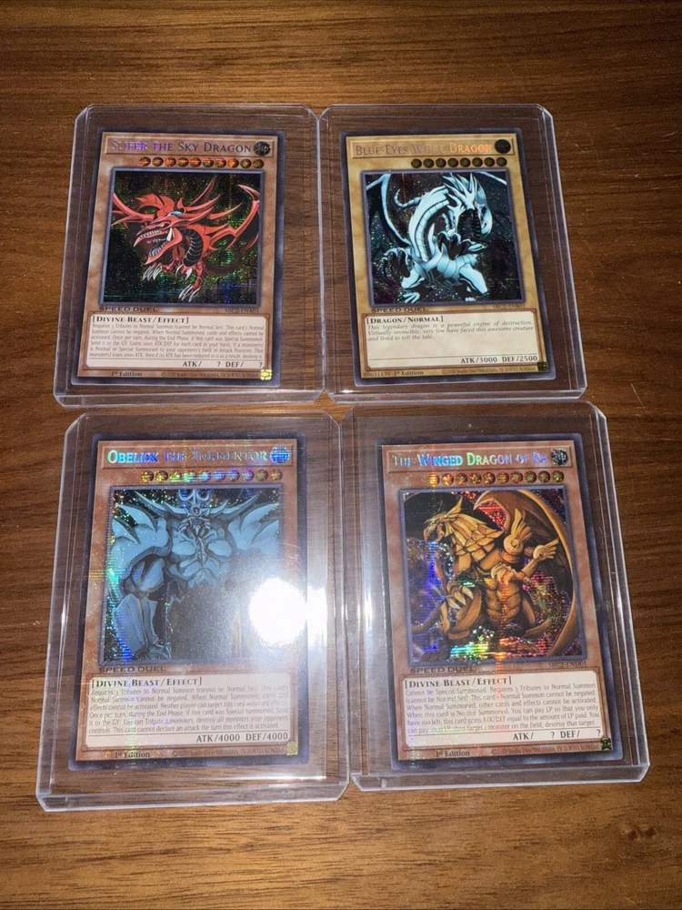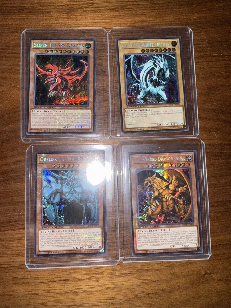 The product is a set of all four ultra rare "Yugioh Blue-Eyes White Dragon STP1-EN004" cards from the Speed Duel series in the Yu-Gi-Oh! Trading Card Game. Blue eyes, white dragon, Slifer the sky dragon, obelisk the tormentor, the winged dragon of ra