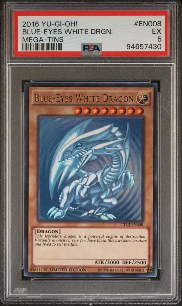 This limited edition Yugioh card features the iconic Blue Eyes White Dragon, with a stunning holofoil design. The card is graded PSA 5, ensuring its authenticity and value. It is perfect for collectors and fans of the Yu-Gi-Oh! TCG game. The card is ideal for those who appreciate rare and unique items, with its Ultra Rare rarity and CT13-EN008 card number. The Dragons card name adds to its appeal, making it a must-have for any serious collector. Don't miss your chance to own this incredible piece of Yugioh history.