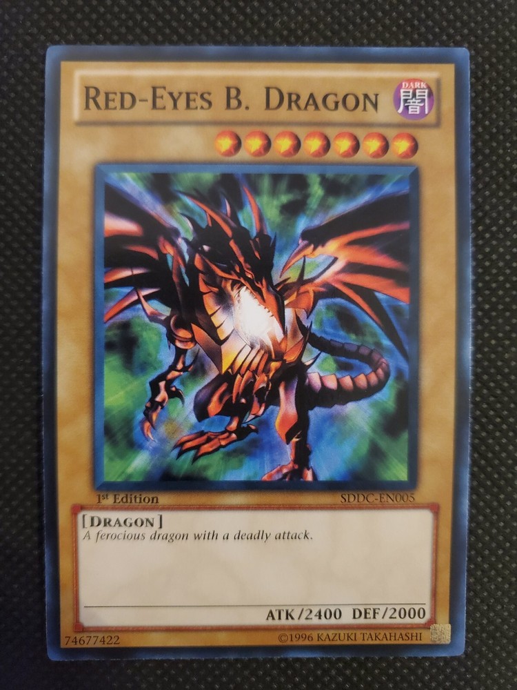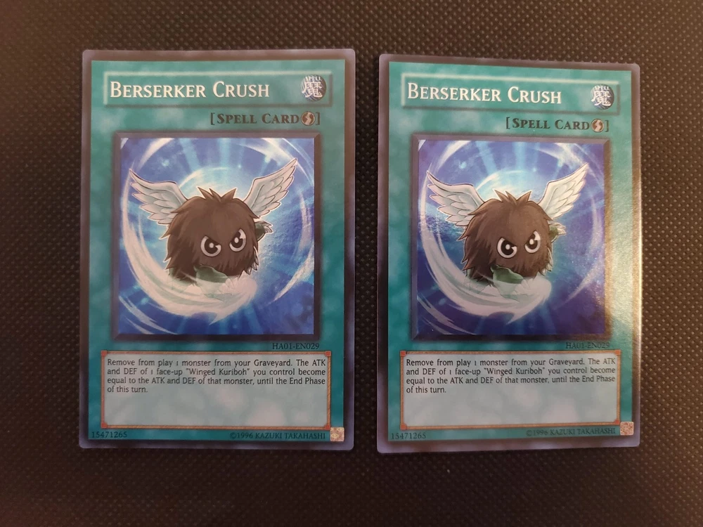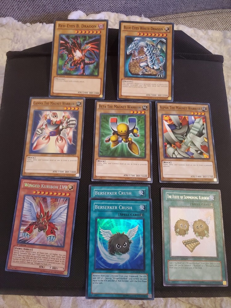 You're viewing 9 (8 different) Yu-Gi-Oh cards, all from an adult collection in a smoke-free, pet-free home: -Blue-Eyes White Dragon (SDDC-EN004, common) -Red Eyes B. Dragon (SDDC-EN005, common) -Alpha The Magnet Warrior (YGLD-ENB11, common) -Beta The Magnet Warrior (YGLD-ENB12, common) -Gamma The Magnet Warrior (YGLD-ENB13, common) -Winged Kuriboh Lv9 (LCGX-EN043, secret rare) -The Flute of Summoning Kuriboh (MDP2-EN004, rare) -x2 Berserker Crush (HA01-EN029, super rare) The cards are in near mint to very lightly played condition, with clean fronts and minimal edge/surface wear (see photos for condition). Will be shipped in a padded mailer with tracking. I'll ship within 3 business days after receiving payment. Thanks so much for looking and check out my other listings for more trading cards!
