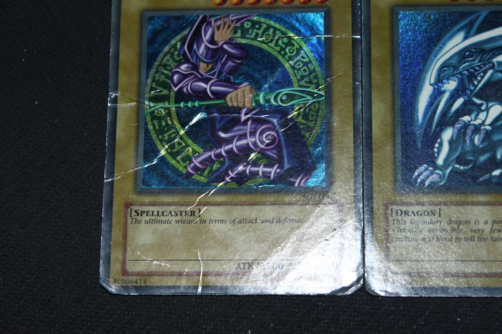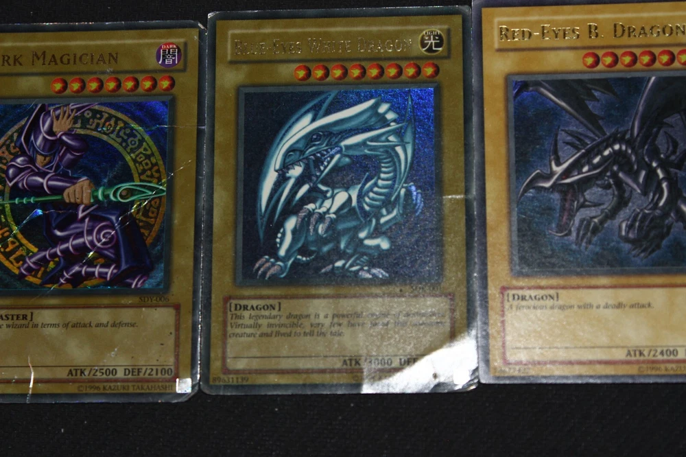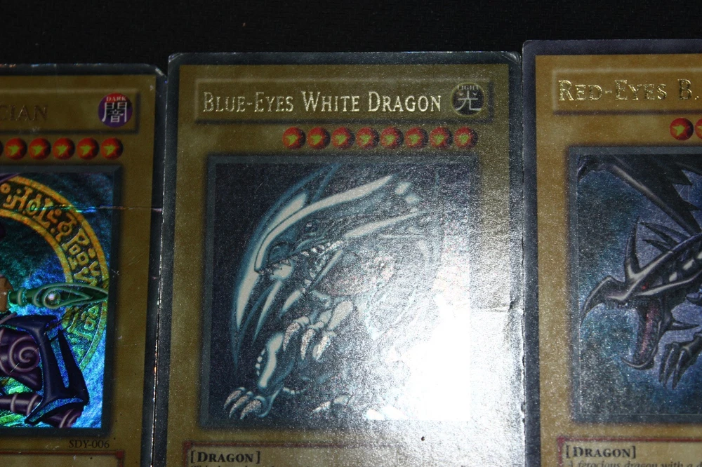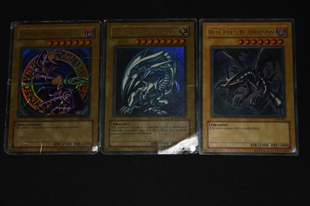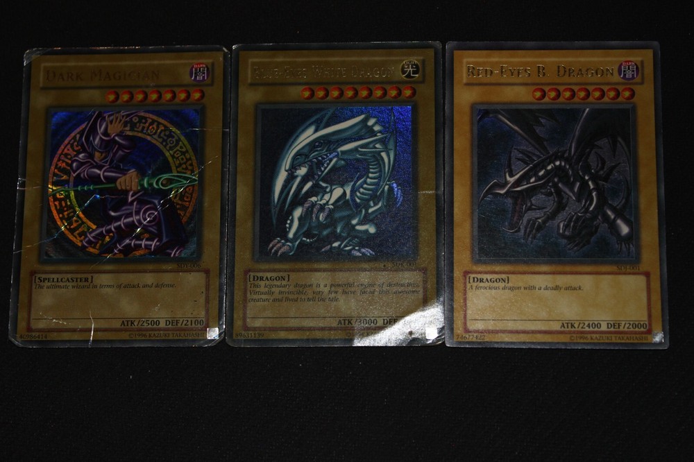You will receive the card(s) pictured above. Read below for more details(particularly regarding the condition of the card(s)): Condition -The cards range from moderately-played(a fair amount of wear) to damaged(a ton of wear) condition; Dark Magician is damaged, Blue-Eyes is heavily-played(a lot of wear), and Red-Eyes is moderately-played Payment -PayPal Payments Preferred. Payment preferred under 48 hours. Shipping - For item listings , $4.58 will be charged for the first listing, with no additional shipping charge for additional item listings ; Shipping provided via USPS within the 50 states with tracking included Returns -If you are unsatisfied with your purchase, send me a message on Ebay, and we can reason through getting you a Refund . Questions -Feel to ask questions.