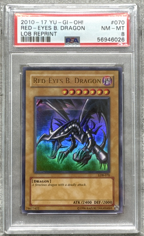The card will come securely wrapped and packaged. A protective sleeve will come placed over the card’s case for added protection. The product is a Yu-Gi-Oh! TCG Ultra Rare Red-Eyes Black Dragon card. It is an English reprint from 2010 with card number LOB-070. Manufactured by Konami, the card features a Holo finish. Graded PSA 8 NM-Mint, this collectible card is highly sought after by fans of the game.