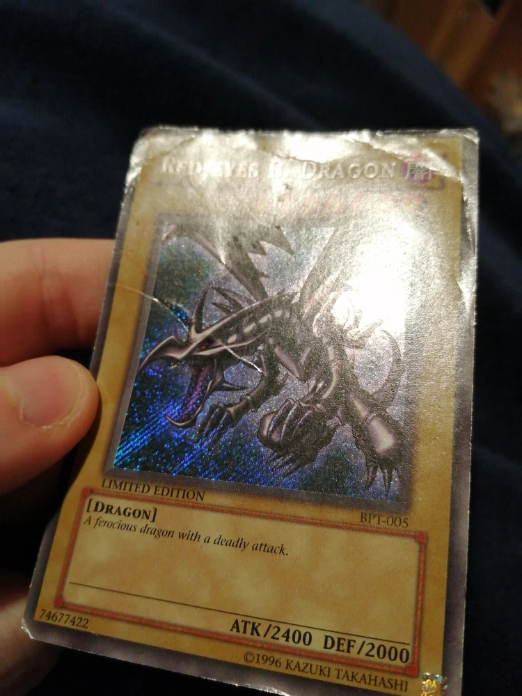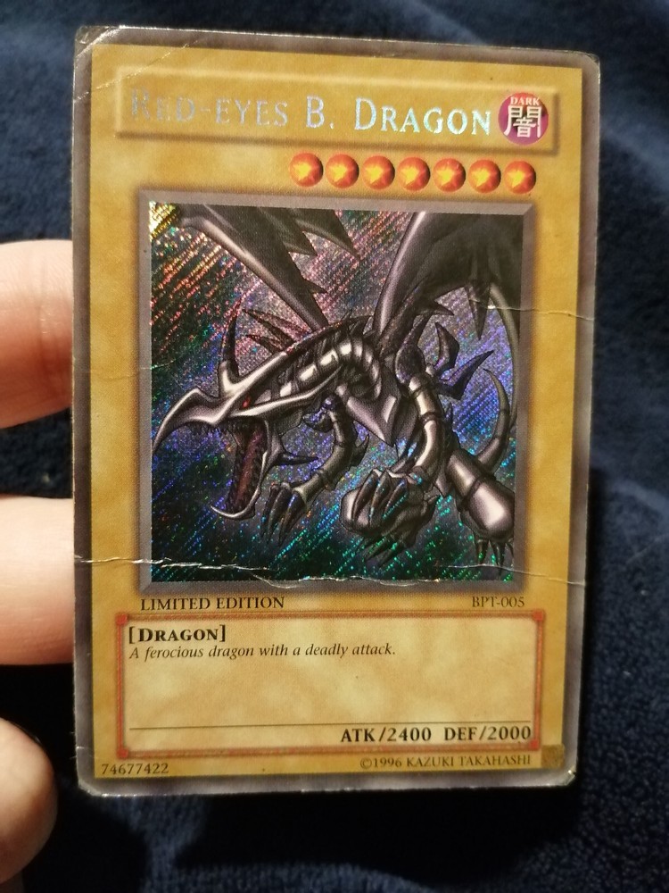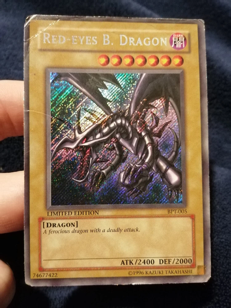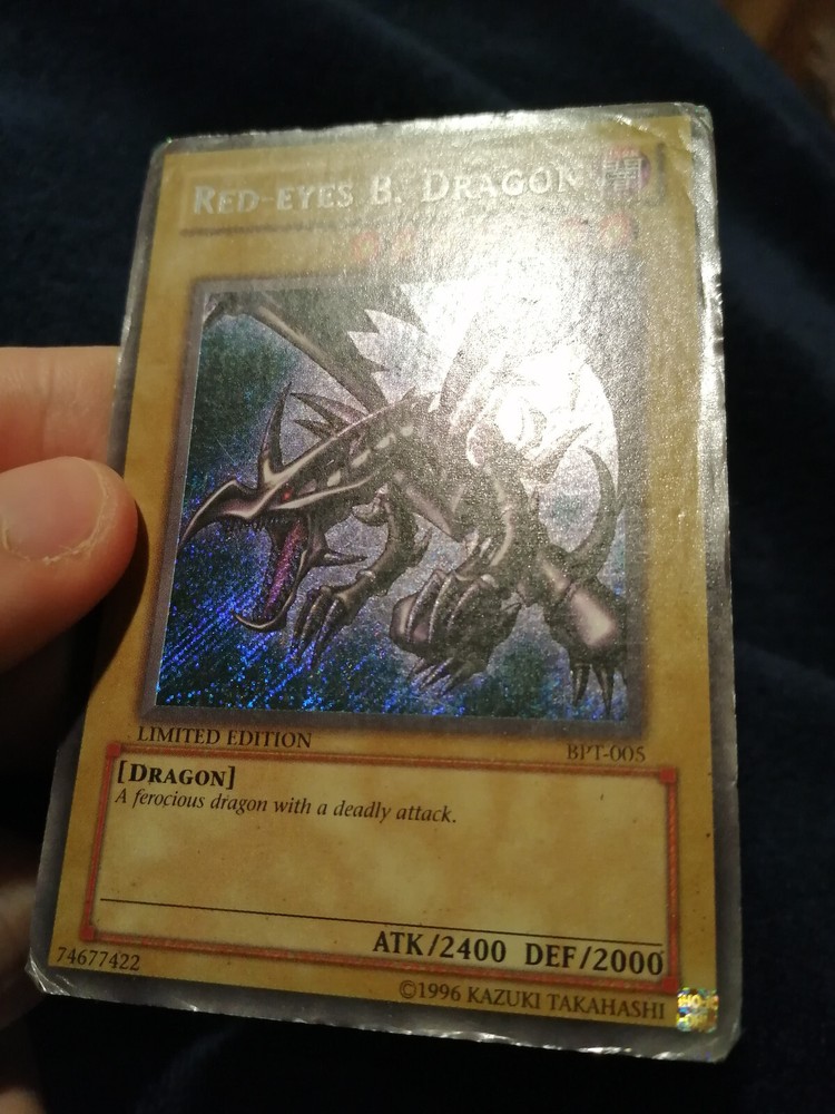 Yugioh Card Red-Eyes Black Dragon BPT-005 Promo Secret Rare Eng Condizioni come da foto. Gli eventuali difetti più evidenti sono stati evidenziati/The card's conditions are as seen in the pic. The main flaws have been highlighted, if any Per altre foto o altre informazioni sono a disposizione/For other photos or info please ask