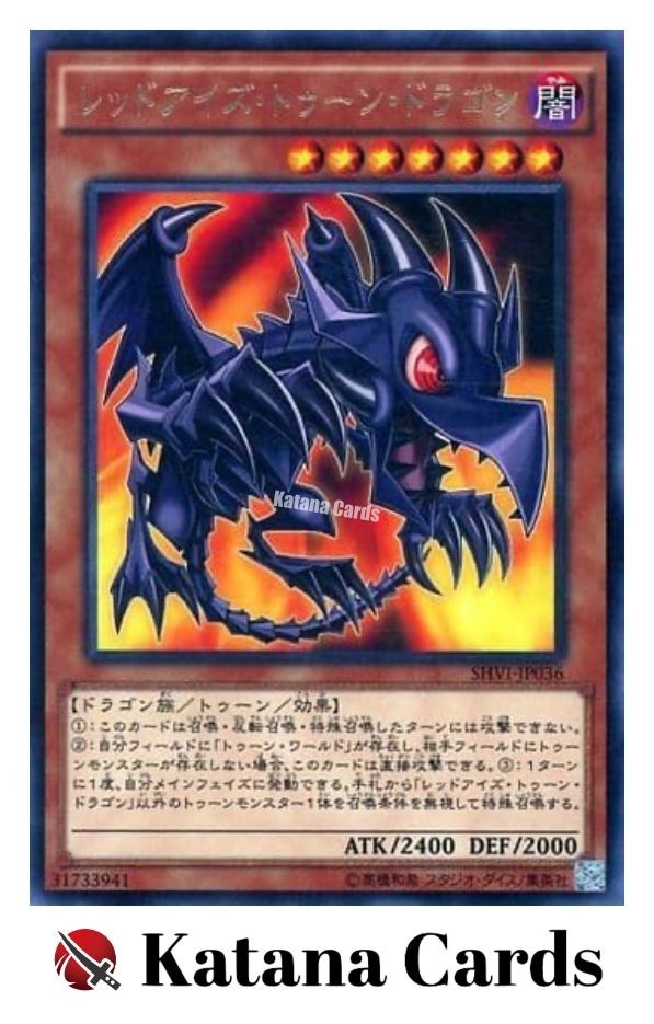Yugioh Cards | Red-Eyes Toon Dragon Rare | SHVI-JP036 Japanese C ondition Near Mint to Excellent Yugioh Cards Check our Yugioh cards here. D iscounts!!! Buy more than 2 cards in my store, Save 3 - 5% off for each cards. Yugioh Cards Check our Yugioh cards here. Discounts are applied automatically by simply adding the product to your cart! If the discount is not applied automatically due to eBay's system error, please inform us of the "Discount Error" in the message after purchasing the item. We will manually apply the discount based on the number of items purchased. S hipping We usually ship within 3 - 5 business days of receiving cleared payment. Economy Shipping - No Tracking Number - It takes 7 - 30 days after shipment. Expedited Shipping - Tracking Number - It takes 3 - 10 days after shipment. If you buy more than 2 cards and choose Expedited Shipping, please select Expedited Shipping for just 1 item. We will ship the items in one package. P ayment We can be contacted at any time through eBay messages if you have any questions, comments or product requests. We will respond to you within 24 hours and do our best to help you out! We encourage our customers to contact us with any questions or concerns! We'd like to be sure you are completely satisfied with your purchase. We do not mark merchandise values below value or mark items as gifts. US and International government regulations prohibit such behavior. I nternational Buyers - Please Note Import duties, taxes, and charges are not included in the item price or shipping cost. These charges are the buyers responsibility. Please check with your country's customs office to determine what these additional costs will be prior to bidding or buying.