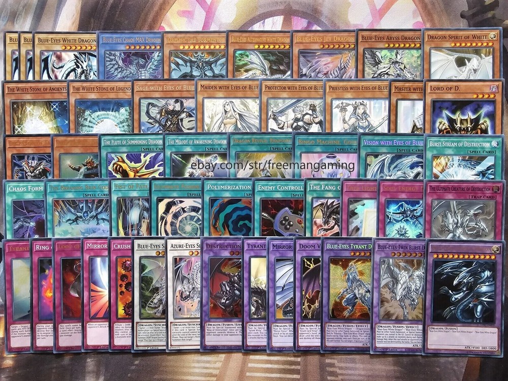 Hello all I am a New Ebay Seller!!! I am a Female Yugioh & Magic Collector!!! Happy Bidding!!! A bonus for ordering you will also Get a Free Holo Card from my collection. It maybe Super Rare, Ultra Rare, or SECRET Rare!!! Picture may have been edited due to Inventory Changes Please read description Below Please Allow me the Set Handling time before your item will be shipped! It may take the full handling time set Thank You!!! Item for sale is: Monsters - 19 3x Blue-Eyes White Dragon 1x Blue-Eyes Chaos MAX Dragon (ultra rare) 1x Obelisk the Tormentor (ultra rare) 1x Blue-Eyes Alternative Dragon (ultra rare) 1x Blue-Eyes Jet Dragon (ultra rare) 1x Blue-Eyes Abyss Dragon (super rare) 1x Dragon Spirit of White 1x The White Stone of Ancients 1x The White Stone of Legend 1x Sage with Eyes of Blue (secret rare) 1x Maiden with Eyes of Blue 1x Protector with Eyes of Blue 1x Priestess with Eyes of Blue 1x Master with Eyes of Blue 1x Lord of D. 1x Dictator of D. (ultra rare) 1x The King of D. (ultra rare) Spells - 13 1x Flute of Summoning Dragon 1x The Melody of Awakening Dragon 1x Dragon Revival Rhapsody (ultra rare) 1x Bingo Machine Go!!! (ultra rare) 1x Vision with Eyes of Blue (secret rare) 1x Burst Stream of Destruction 1x Chaos Form 1x The Breaking Ruin God (ultra rare) 1x Ultimate Fusion (ultra rare) 1x Polymerization (super rare) 1x Enemy Controller (super rare) 1xThe Fang of Critias Traps - 8 1x True Light (ultra rare) 1x Soul Energy MAX!!! (ultra rare) 1x The Ultimate Creature of Destruction (ultra rare green, purple, or blue) 1x Tyrant Wing (ultra rare) 1x Loop of Destruction (ultra rare) 1x Ring of Destruction 1x Mirror Force 1x Crush Card Virus Extra Deck - 9 1x Blue-Eyes Spirit Dragon (super rare) 1x Azure-Eyes Silver Dragon 1x Destruction Dragon (ultra rare) 1x Tyrant Burst Dragon 1x Mirror Force Dragon 1x Doom Virus Dragon 1x Blue-Eyes Tyrant Dragon (secret rare) 1x Blue-Eyes Twin Burst Dragon (ultra rare green, purple, or blue) 1x Blue-Eyes Ultimate Dragon