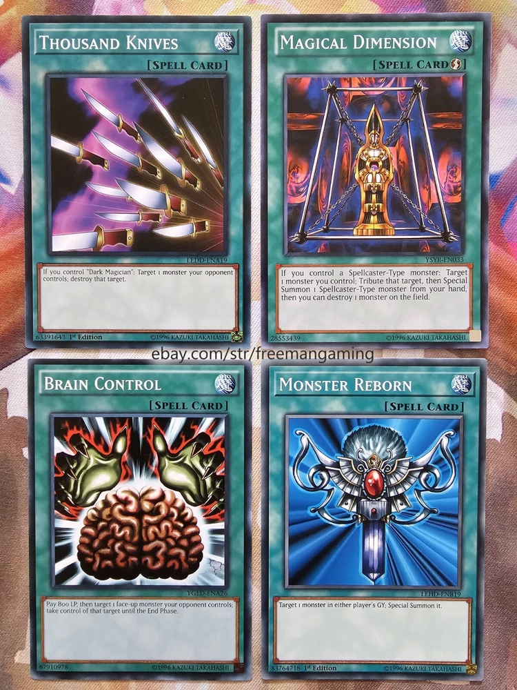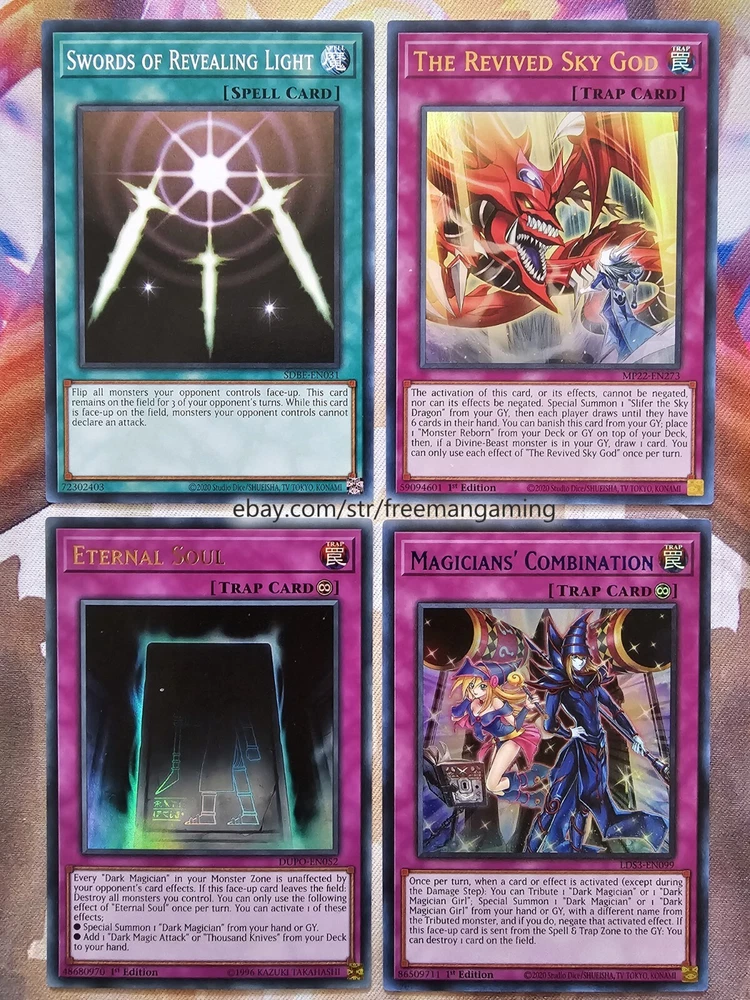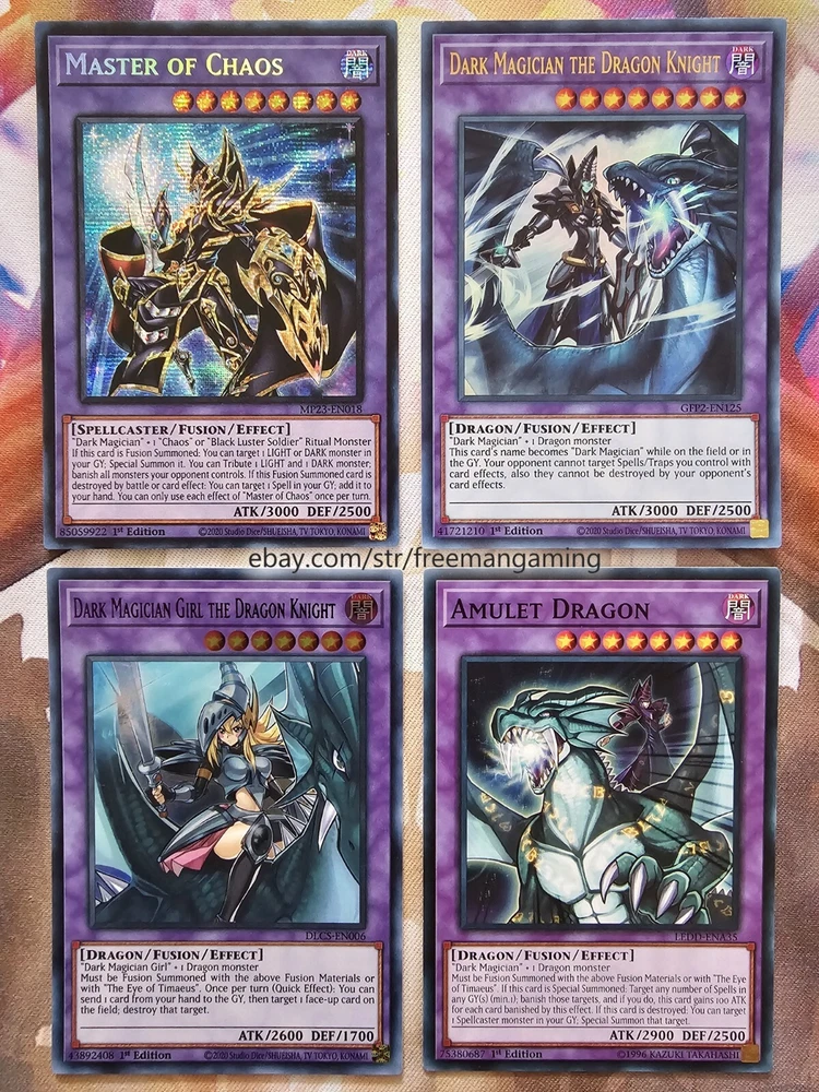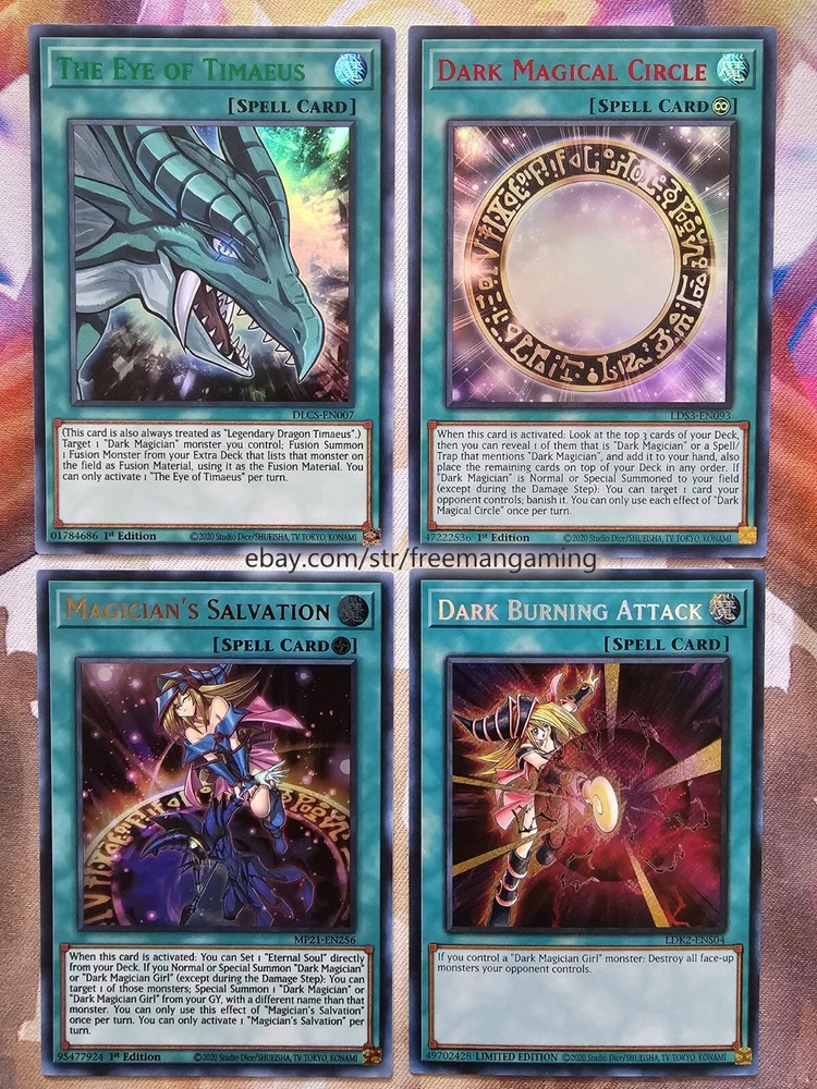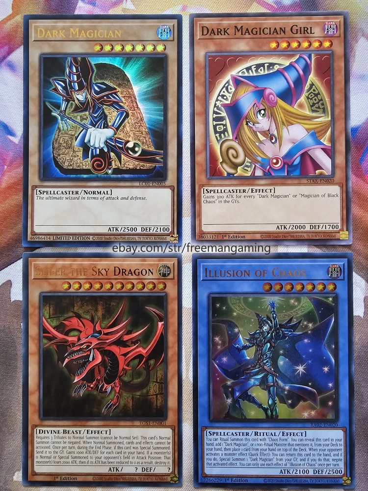 Item Description This 40 Card Dark Magician Deck (with 9 card extra deck) is fully built and ready to play! All cards are in NM Near Mint condition! Monsters - 19 1x Dark Magician (ultra rare) 1x Dark Magician Girl 1x Slifer the Sky Dragon (ultra rare) 1x Illusion of Chaos (ultra rare) 1x Magicians' Souls (ultra rare) 1x Timaeus The United Dragon (secret rare) 1x Apprentice Illusion Magician (colored ultra rare) 1x Magikuriboh (ultra rare) 1x Magician of Dark Illusion 1x Magician's Rod 1x Magician's Robe 1x Breaker the Magical Warrior 1x Skilled Dark Magician 1x Dimension Conjurer 1x Buster Blader 1x Kuriboh 1x King's Knight 1x Queen's Knight 1x Jack's Knight Spells - 14 1x Polymerization (super rare) 1x The Eye of Timaeus (colored ultra rare) 1x Dark Magical Circle (colored ultra rare) 1x Magician's Salvation (ultra rare) 1x Dark Burning Attack (secret rare) 1x Thunderforce Attack (ultra rare) 1x Dark Magic Attack 1x Secrets of Dark Magic 1x Dark Magic Curtain 1x Thousand Knives 1x Magical Dimension 1x Brain Control 1x Monster Reborn 1x Swords of Revealing Light Traps - 7 1x The Revived Sky God (ultra rare) 1x Eternal Soul (ultra rare) 1x Magician's Combination (colored ultra rare) 1x Magician Navigation 1x Magical Hats 1x Magic Cylinder (super rare) 1x Mirror Force (super rare) Extra Deck - 9 1x Master of Chaos (secret rare) 1x Red-Eyes Dark Dragoon (ultra rare) 1x Dark Magician the Dragon Knight (ultra rare) 1x Dark Magician Girl the Dragon Knight (colored ultra rare) 1x Amulet Dragon 1x Dark Paladin 1x Arcana Knight Joker 1x Ebon High Magician 1x Ebon Illusion Magician (colored ultra rare) All items are in mint/near mint condition unless otherwise specified in the title or description. This listing is for the items named in the title and pictured here. What you see in the picture is what you will receive.