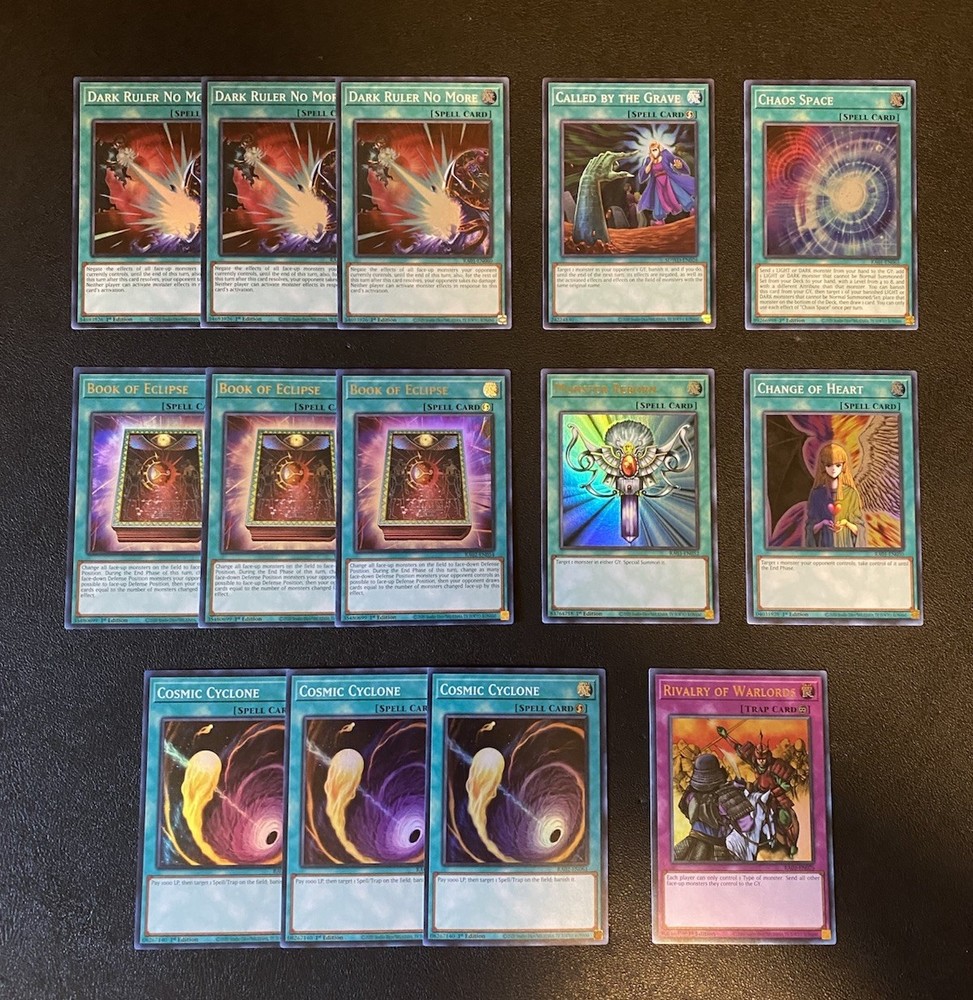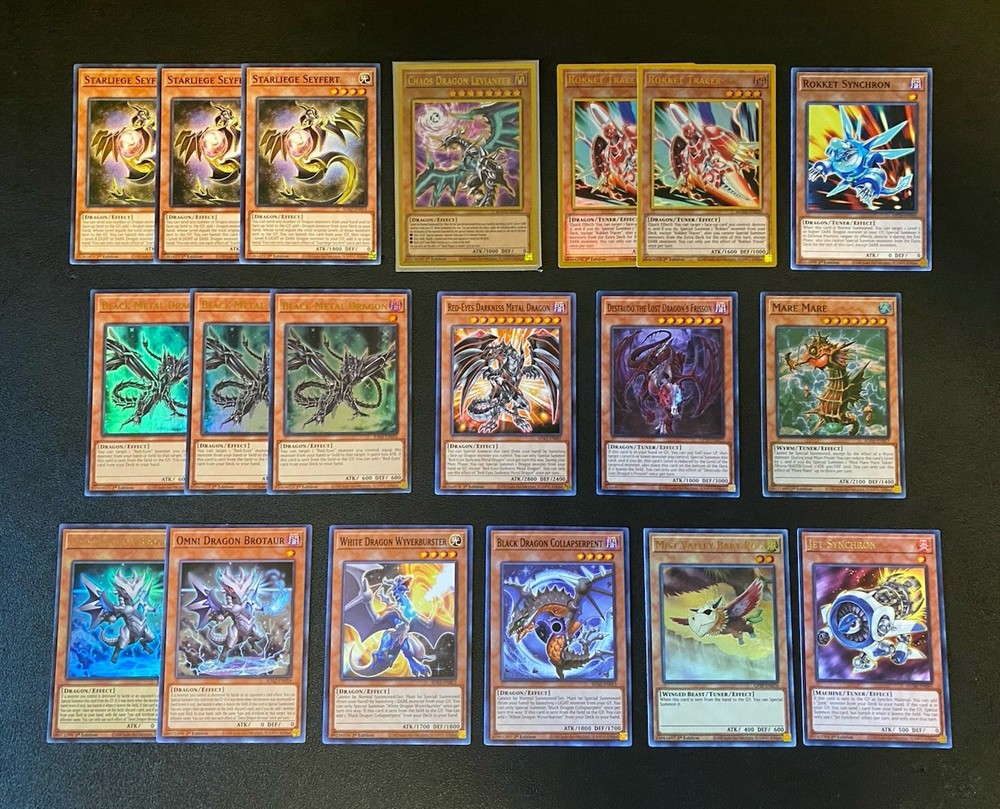 Dragon Link Deck - Near Mint Extra Deck: 1x Striker Dragon - Ultra Rare 2x Hieratic Seal of Heavenly Spheres - Super Rare 1x Dragunity Knight - Romulus - Rare 1x Dillingerous Dragon - Common 1x Dharc The Dark Charmer, Gloomy - Super Rare 1x Knightmare Phoenix - Ultra Rare 1x Knightmare Unicorn - Ultra Rare 1x WorldSea Dragon Zealantis - Secret Rare 2x Borrelend Dragon - Secret Rare 1x Crystal Wing Synchro Dragon - Ultra Rare 1x Scarlight Red Dragon Archfiend - Common 1x Hot Red Dragon Archfiend Abyss - Common 1x Crimson Dragon - Ultra Rare Monsters: 3x Starliege Seyfert - Common 1x Chaos Dragon Levianeer - Gold Rare 2x Rokket Tracer - Gold Rare 1x Rokket Synchron - Common 3x Black Metal Dragon - Ultra Rare 1x Red-Eyes Darkness Metal Dragon - Common 1x White Dragon Wyverburster - Common 1x Black Dragon Collapserpent - Common 2x Omni Dragon Brotaur - 1 Ultra Rare + 1 Common 1x Destrudo The Lost Dragon’s Frisson - Common 1x Mare Mare - Super Rare 1x Mist Valley Baby Roc - Ultra Rare 1x Jet Synchron - Rare 3x Effect Veiler - Common 3x Ghost Ogre & Snow Rabbit - Ultra Rare 3x Ghost Mourner & Moonlit Chill - Super Rare Spells: 3x Dark Ruler No More - Common 1x Chaos Space - Super Rare 3x Book of Eclipse- Ultra Rare 3x Cosmic Cyclone - Super Rare 1x Change of Heart - Super Rare 1x Monster Reborn - Ultra Rare 1x Called By The Grave - Common Traps: 1x Rivalry of Warlords - Ultra Rare
