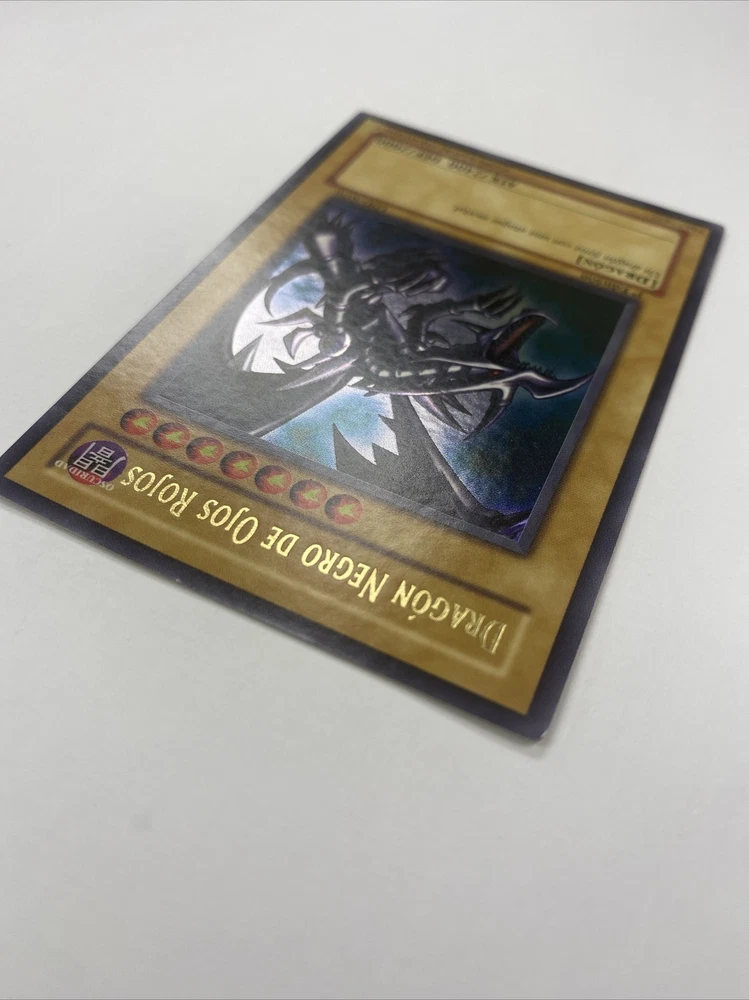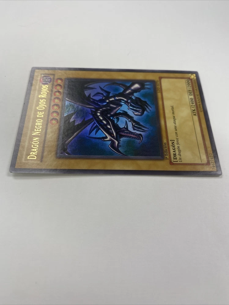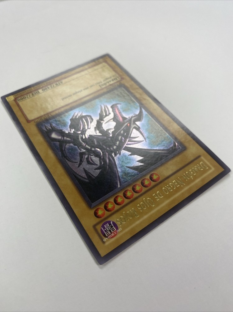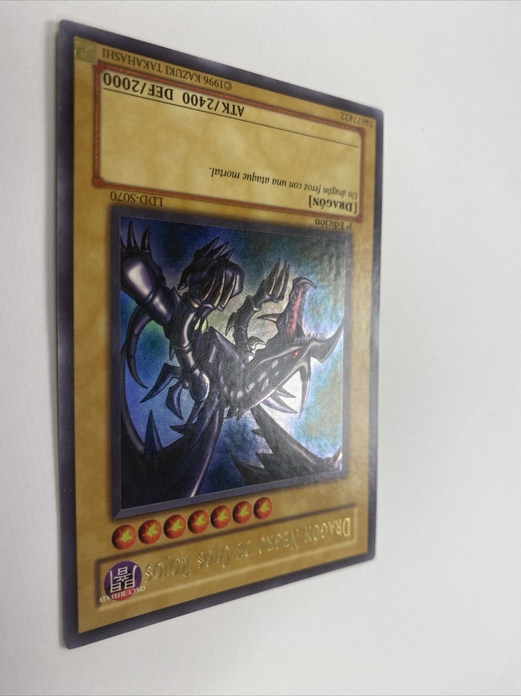 This Yu-Gi-Oh! trading card features the fearsome Spanish Version of Red Eyes Black Dragon, LDD-S070 known for its impressive attack power of 2400 and tough defense of 2000. It is a holo card in a Spanish language edition of the English equivalent: “Legend of Blue Eyes White Dragon” LOB-070. The card is a 1st edition and is in near mint condition, making it a valuable addition to any collection. Whether you are a collector or a player, this Ultra Rare monster card is sure to impress. Its dark color and Dragon monster type adds to its menacing appearance, making it a must-have for fans of the Yu-Gi-Oh! TCG. Don't miss out on the opportunity to own this highly sought-after card!