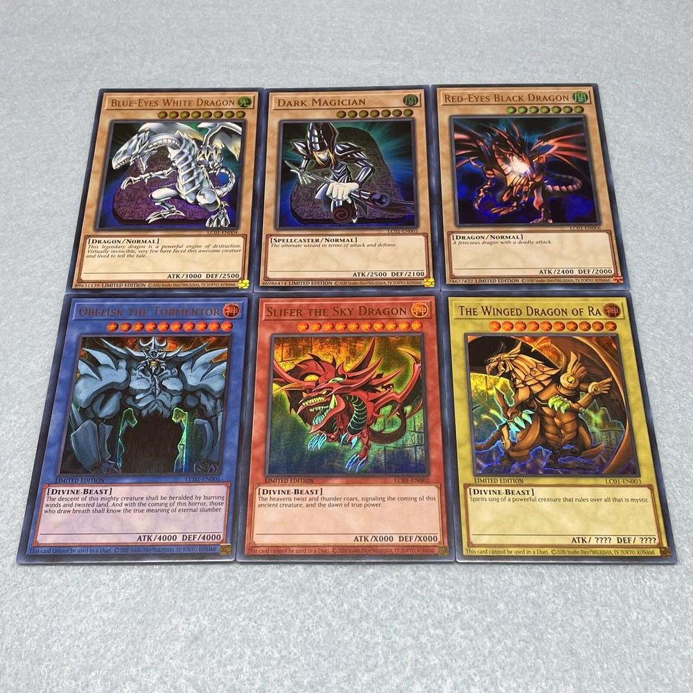 Includes the three Egyptian God Cards: Obelisk the Tormentor, Slifer the Sky Dragon, The Winged Dragon of Ra. Also includes Blue-Eyes White Dragon, Dark Magician, and Red-Eyes Black Dragon. All cards are holographic and authentic.