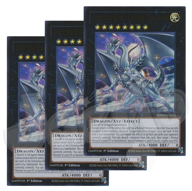 Indigo-Eyes Silver Dragon x 3 1st Edition - Ultra Rare The cards are in NM condition. Also will include a free Holographic card which can be a rarity of Super, Ultra, Secret, etc! Card Information 2 Level 8 Dragon monsters Cannot attack directly unless this card has a Normal Monster as material. You can only use each of the following effects of "Indigo-Eyes Silver Dragon" once per turn. If this card is Xyz Summoned: You can negate the effects of all face-up cards your opponent currently controls. You can detach 1 material from this card, then target 1 Normal Monster in your GY or banishment; Special Summon it, and if you do, it gains 1000 ATK. Number: SDWD-EN032 Rarity: Ultra Rare