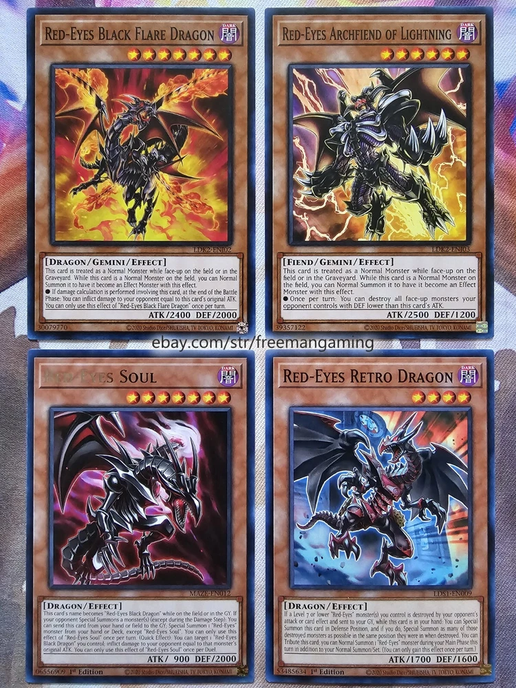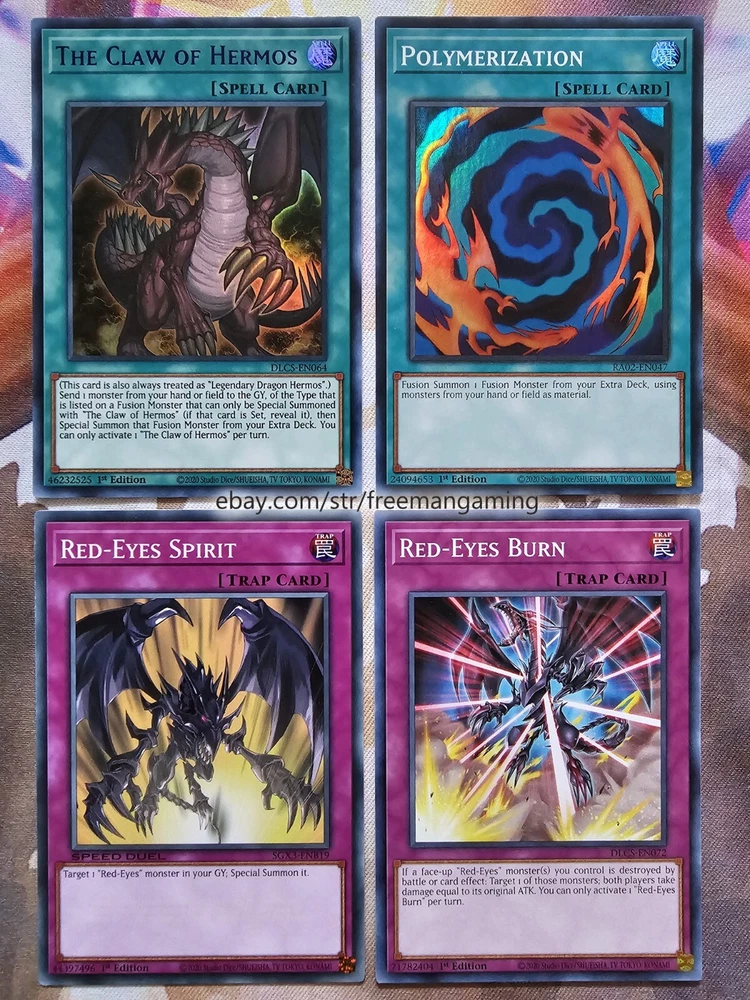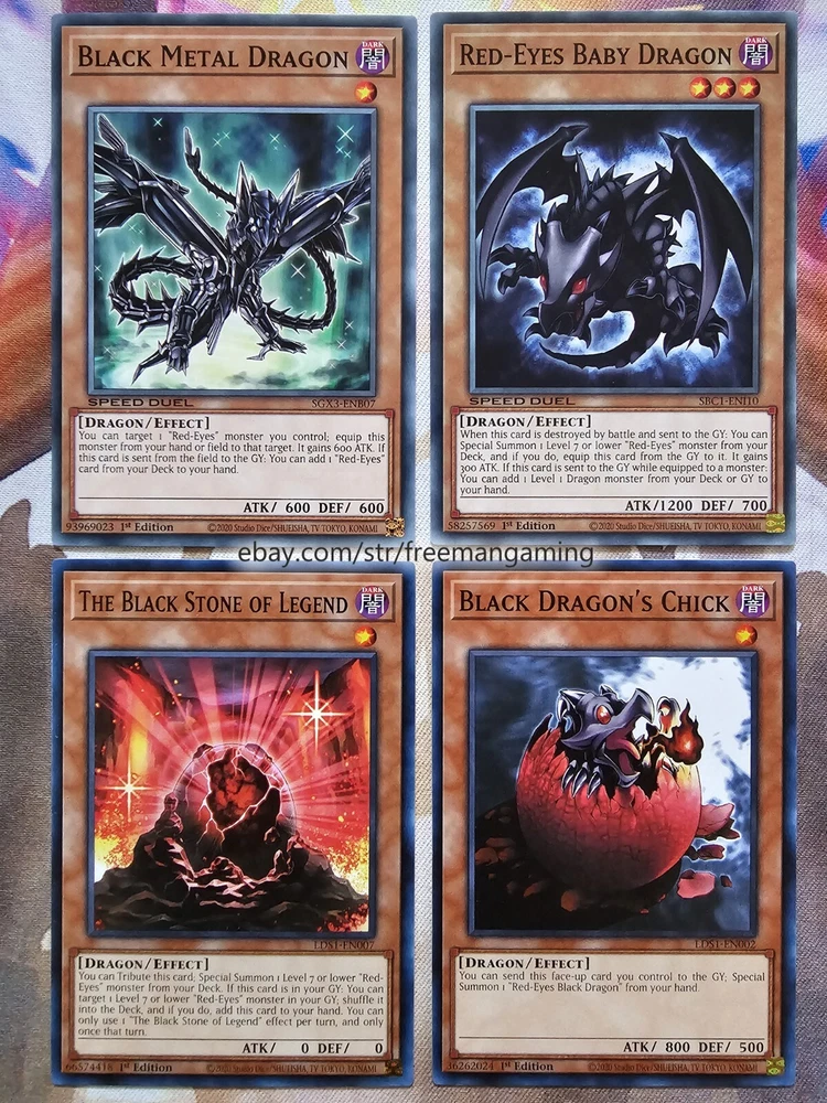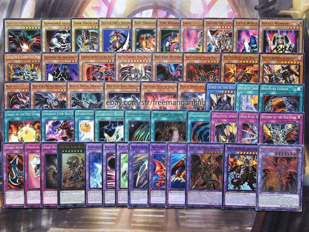 Item Description All cards are in NM Near Mint Condition. All cards included have been used by Joey Wheeler in the TV Show and official Konami Yugioh Video Games. Monsters x25 - 1x Red-Eyes Black Dragon (ultra rare) 1x Summoned Skull 1x Dark Magician 1x Alligator's Sword 1x Baby Dragon 1x Time Wizard 1x Jinzo 1x Gilford the Lightning 1x Little-Winguard 1x Rocket Warrior 1x Giltia the D. Knight Soul Spear (secret rare) 1x Gearfried the Iron Knight 1x Gearfried the Red-Eyes Iron Knight 1x Red-eyes Darkness Metal Dragon 1x Red-Eyes Wyvern 1x Red-Eyes Black Meteor Dragon (super rare) 1x Red-Eyes Black Flare Dragon 1x Red-Eyes Archfiend of Lightning 1x Red-Eyes Soul 1x Red-Eyes Retro Dragon 1x Black Metal Dragon 1x Red-Eyes Baby Dragon 1x The Black Stone of Legend 1x Black Dragon's Chick 1x Lord of Red (secret rare) Spells x9 - 1x Red-Eyes Transmigration 1x Red-Eyes Fusion 1x Cards of the Red Stone 1x Inferno Fire Blast 1x Scapegoat 1x Lightning Blade 1x Dragon Nails (ultra rare) 1x The Claw of Hermos (ultra rare green, purple, or blue) 1x Polymerization (super rare) Traps x6 - 1x Red-Eyes Spirit 1x Red-Eyes Burn 1x Return of the Red-Eyes 1x Kunai with Chain 1x Magical Arm Shield 1x Trap Hole with Spikes Extra Deck x10 - 1x Red-Eyes Flare Metal Dragon (ultra rare) 1x Meteor Black Comet Dragon (ultra rare) 1x Archfiend Black Skull Dragon 1x Red-Eyes Dark Dragoon (super rare) 1x Thousand Dragon 1x Alligator's Sword Dragon 1x Red-Eyes Black Dragon Sword 1x Rocket Hermos Cannon 1x Goddess Bow 1x Time Magic Hammer All items are in mint/near mint condition unless otherwise specified in the title or description. This listing is for the items named in the title and pictured here. What you see in the picture is what you will receive.