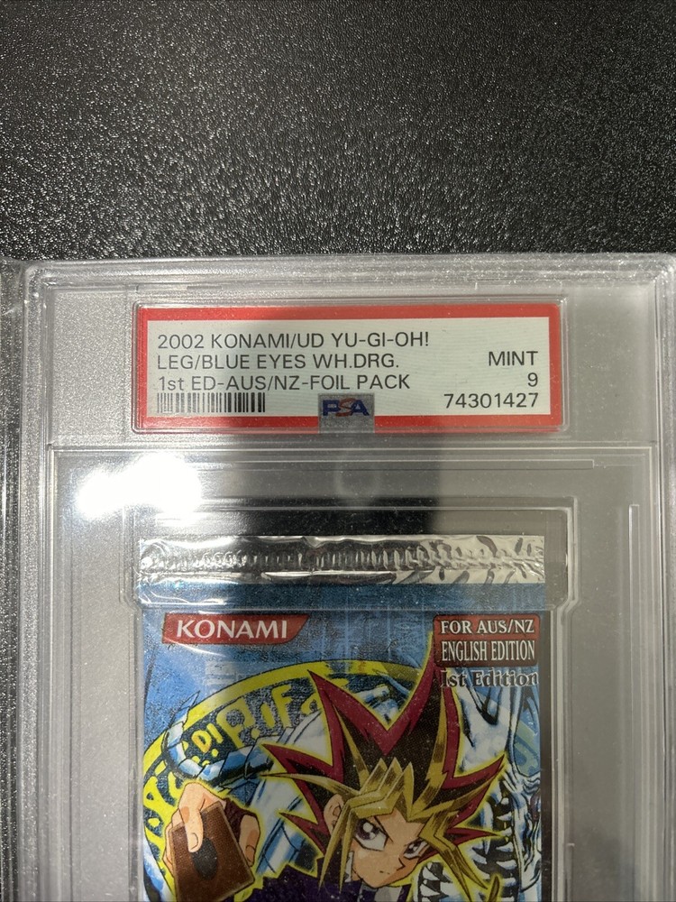 This Yu-Gi-Oh! TCG booster pack features the highly sought-after Legend of Blue Eyes White Dragon set, complete with 1st edition cards and a PSA 9 rating. The pack is factory sealed and includes a variety of cards, including rare cards that collectors will love. The configuration is a pack, making it easy to add to your collection. The features of this pack include the booster style and 1st edition cards. The categories for this item are Toys & Hobbies and Collectible Card Games, specifically CCG Sealed Packs. This is a must-have item for any Yu-Gi-Oh! collector or enthusiast.