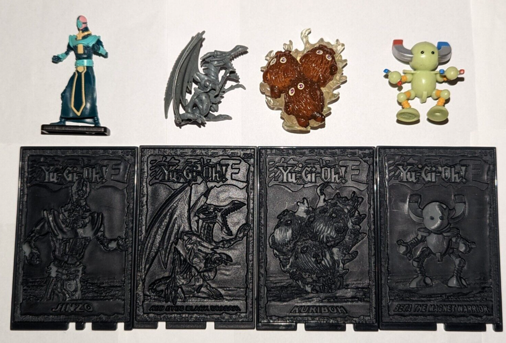 This is a custom lot of 4 Yugioh mini-figures. Each figure is a few inches tall. You will get the four figures & four cards shown in the pictures. The figures may be very slightly sticky due to age and degradation of plastic since they are a decade or two old. All items are in good condition otherwise. Description: Figure one is Jinzo with respective semi-transparent card. The card is number # 103 Figure two is Red Eyes Black Dragon with respective semi-transparent card. The card is number # 25 Figure three is Kuriboh with respective semi-transparent card. The card is number # 95 Figure four is the Beta The Magnet Warrior with respective semi-transparent card. The card is number # 10 These items are from a smoke-free environment & I am the original owner of them. USA buyers only! Check out the Yugioh lots and other products I have listed! Thank you