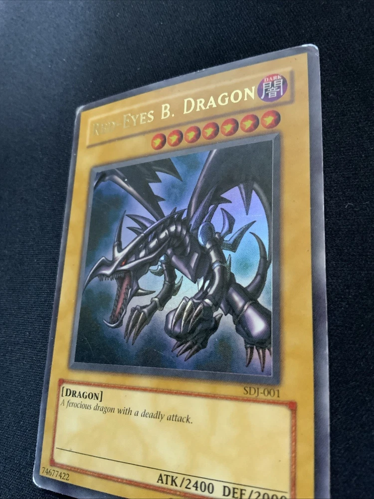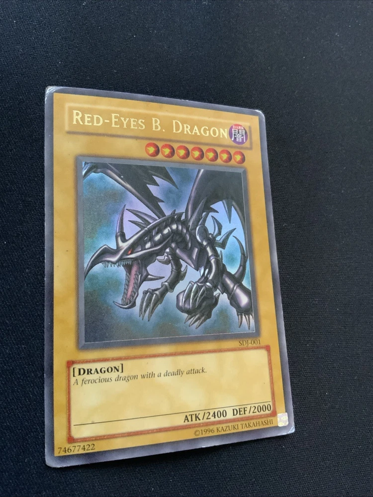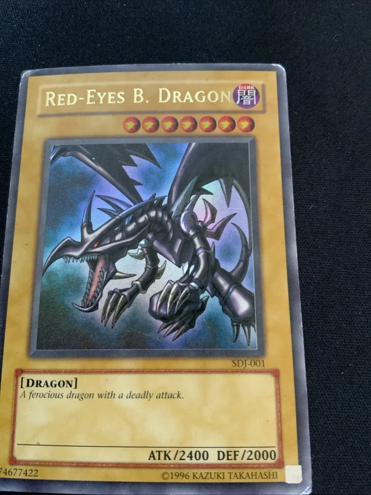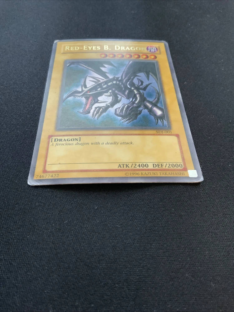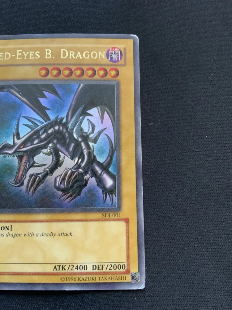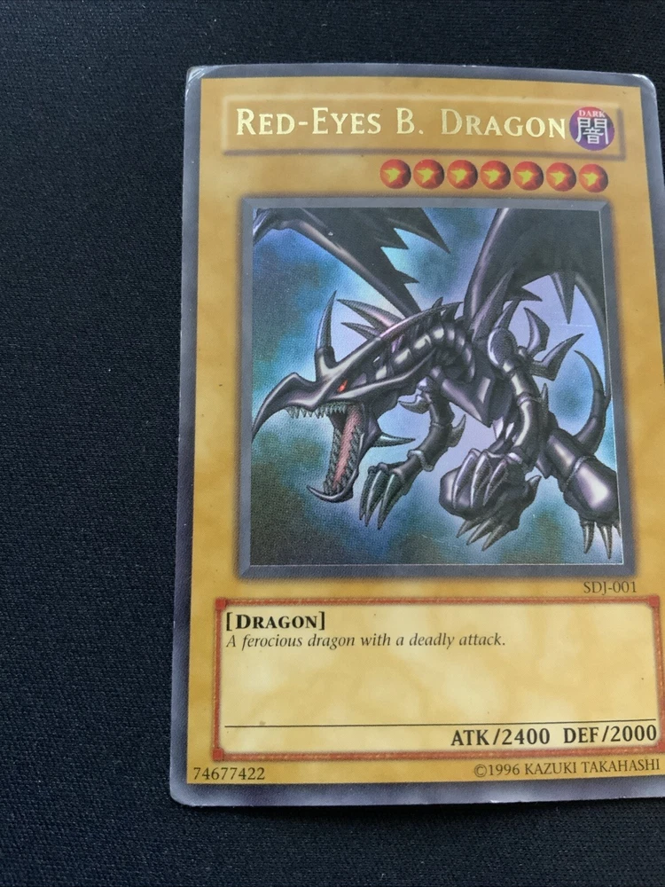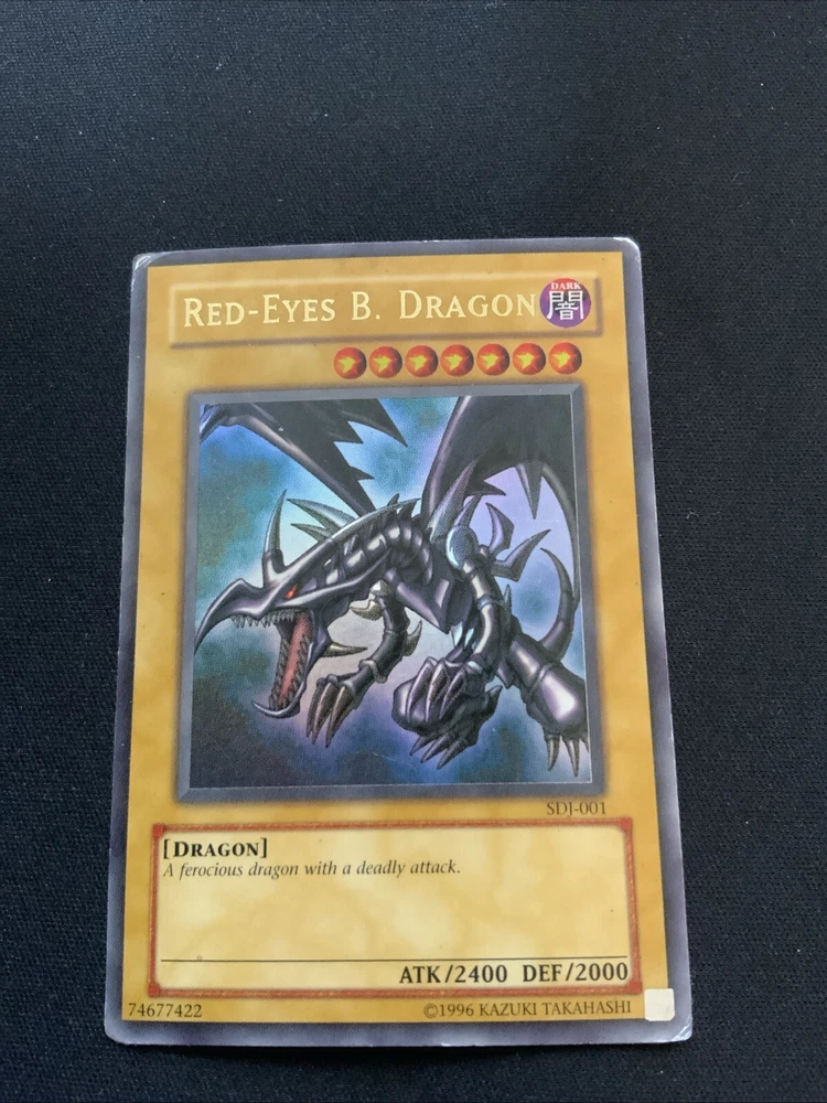This highly sought-after card is a must-have for any Yu-Gi-Oh! collector or player. With its stunning Ultra Rare design and powerful abilities, the Red Dragon card is sure to impress. This card is from the Starter Deck: Joey set and features the card number SDJ-001. It is an Unlimited edition moderat card that will be a valuable addition to any collection. The Red Dragon card is perfect for players looking to dominate their opponents with its impressive stats and abilities. It is also a great addition to any collection, especially for fans of the game. Don't miss out on the opportunity to own this amazing card! Corners are crumbled a bit and has whitening on back. Slight grime on back.